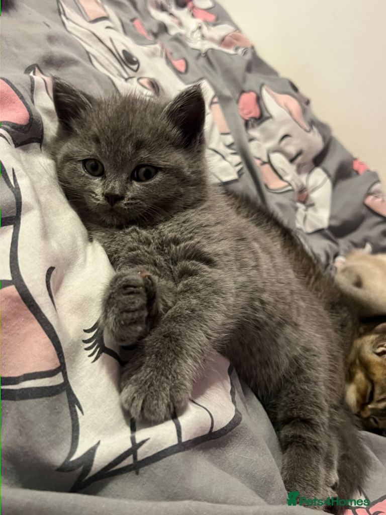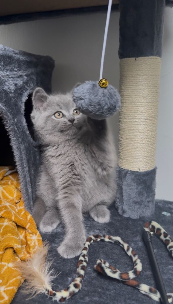 Here is my lovely 8.5 week old British Blue Shorthair Pure breed boy Mylo, due to be 9 weeks on the 25th, (4 days) I just got him recently but it is with great sadness that I have to rehome him due to my toddler niece and nephew and a few family members having allergies we were unaware of. He is such a loving, sweet boy who will cuddle with you, loves affection and being near you.