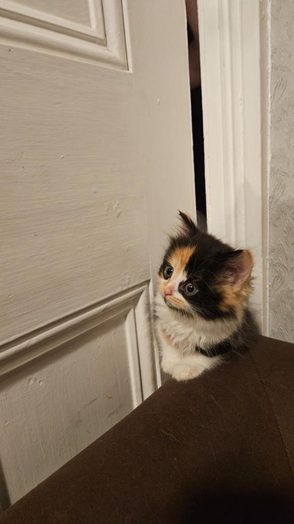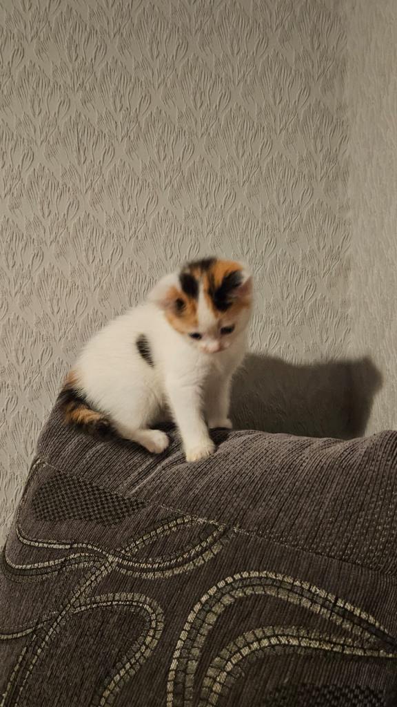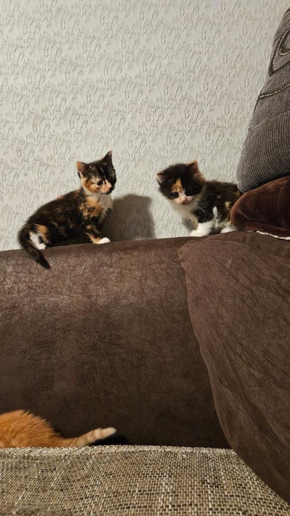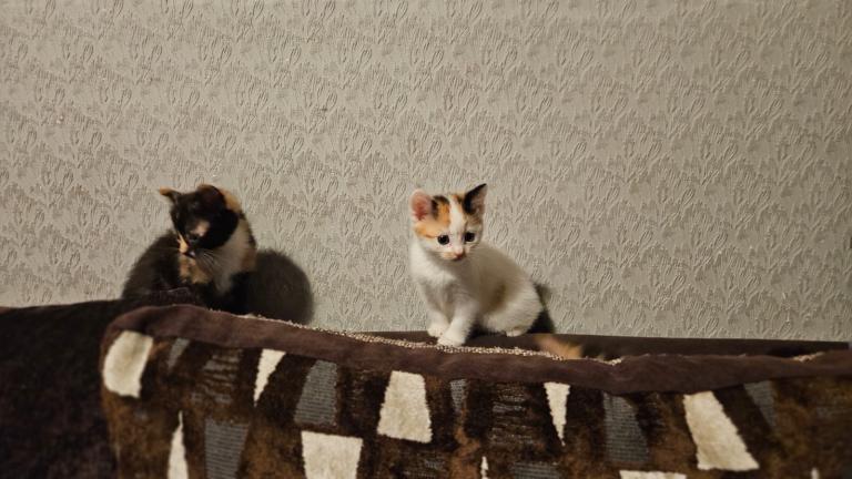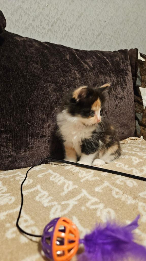 There are 3 girls and 2 boys available. The three girls are all beautiful calico (tri-colour). One boy is ginger, and the other is black and white. Two of the kittens are very fluffy, while the other three have medium-length fur.