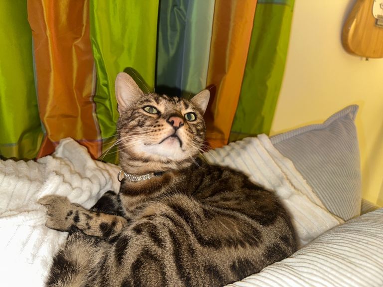 He’s a really striking boy with a beautiful patterned coat and clear markings, and he has lovely blue eyes. He’s affectionate, enjoys human company, and likes being around people. As he’s fully grown now, he’s settled and past the very high-energy kitten phase, but he’s still intelligent and benefits from attention and interaction like most Bengals.