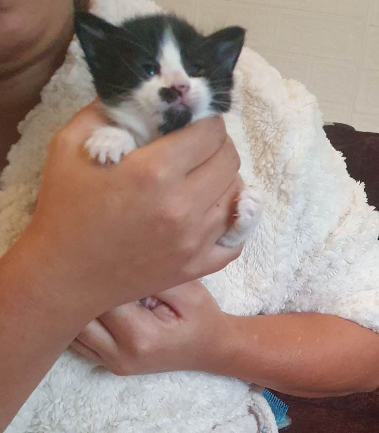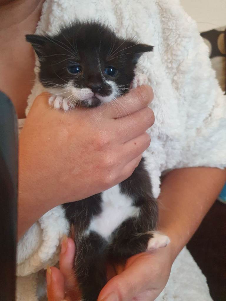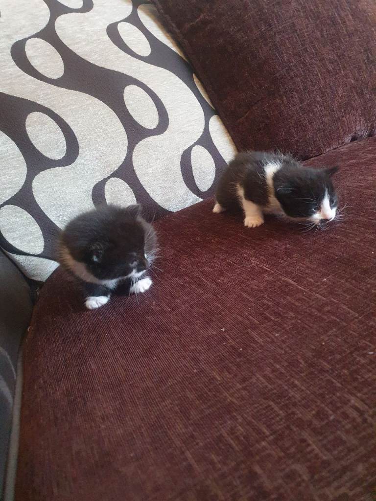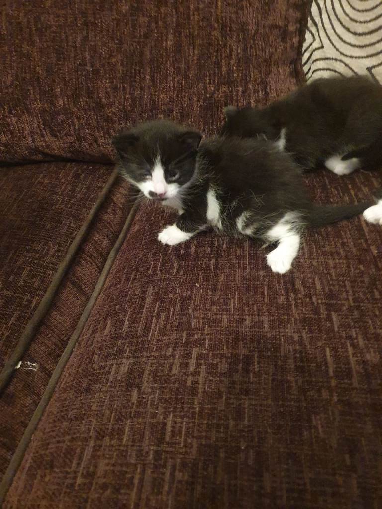 I have two kittens, one is a boy and the other is a girl, they are black and white, one girl has blue eyes and needs a new family.