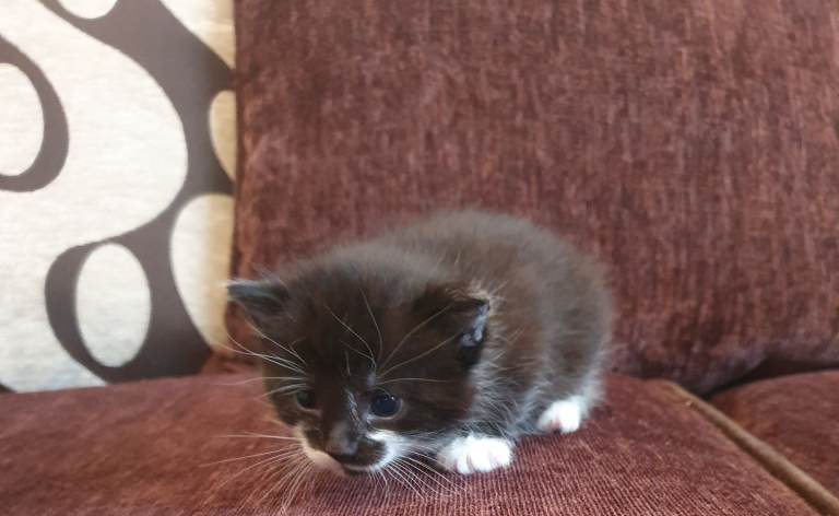 Posting for 6+ yearsI have two black and white kittens, a boy and a girl, one with blue eyes.