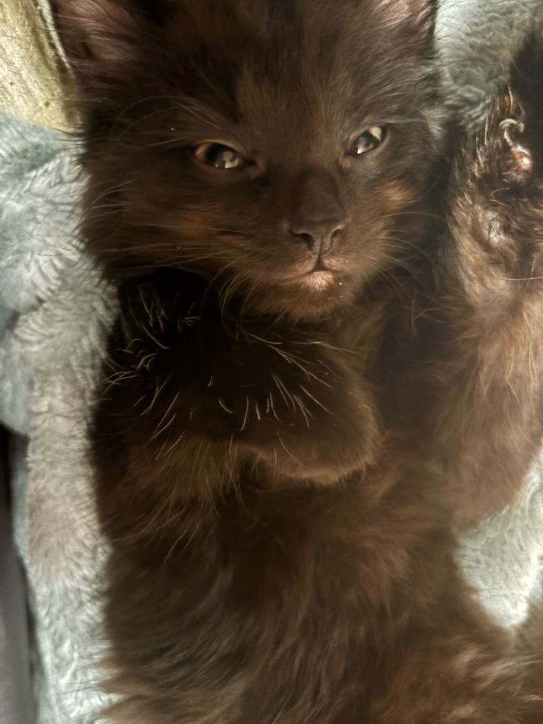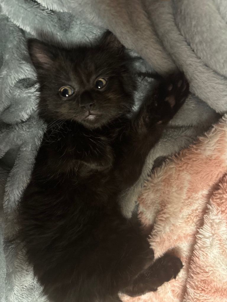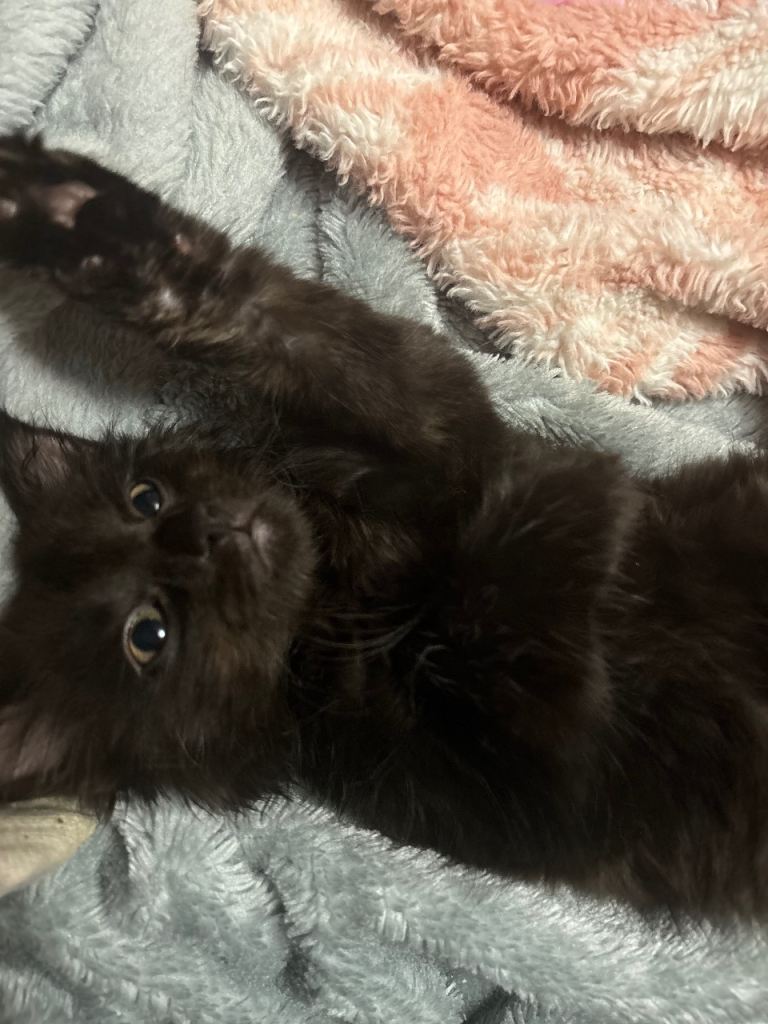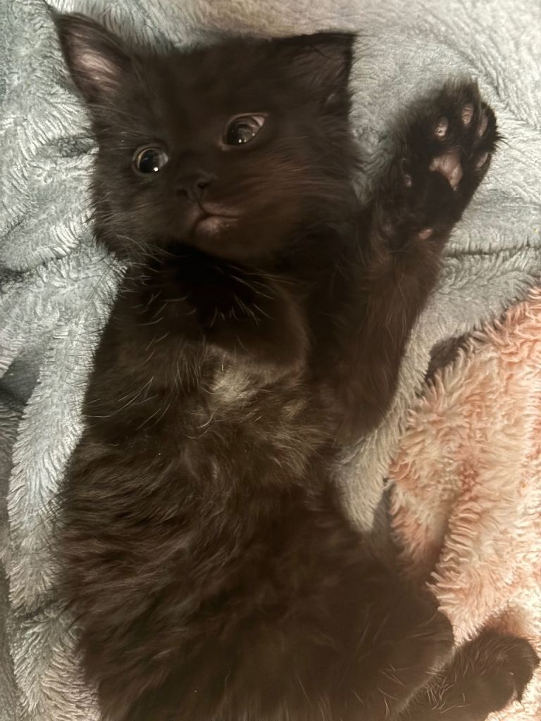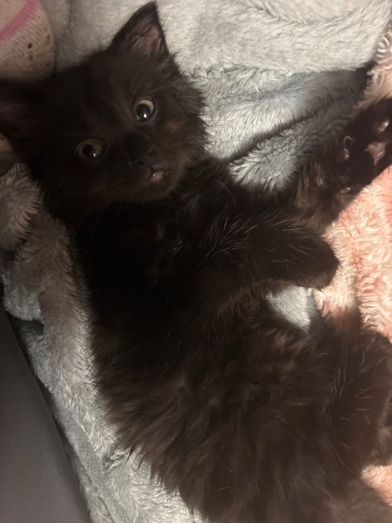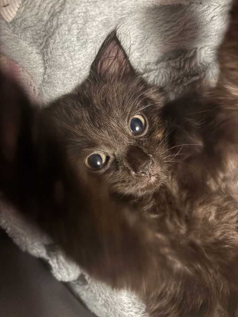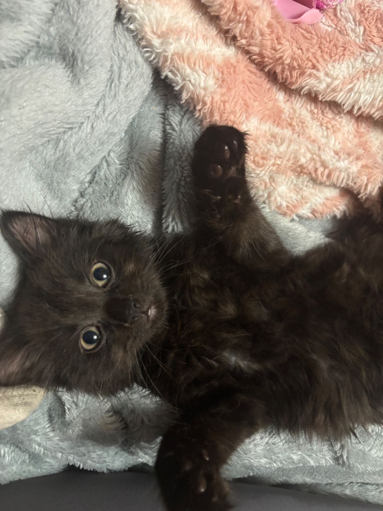Mum is a slim black cat dad is a fluffy grey cat all his other siblings are sold he is a litter of 4 kittens 2 grey two black