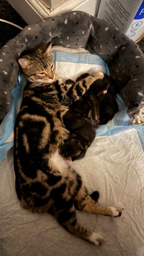5 kitten - mother is mixed bengal and British, father is tabby cart, stripy cats are £150, to book your kitten deposit £50. (Tha last picture is mother)