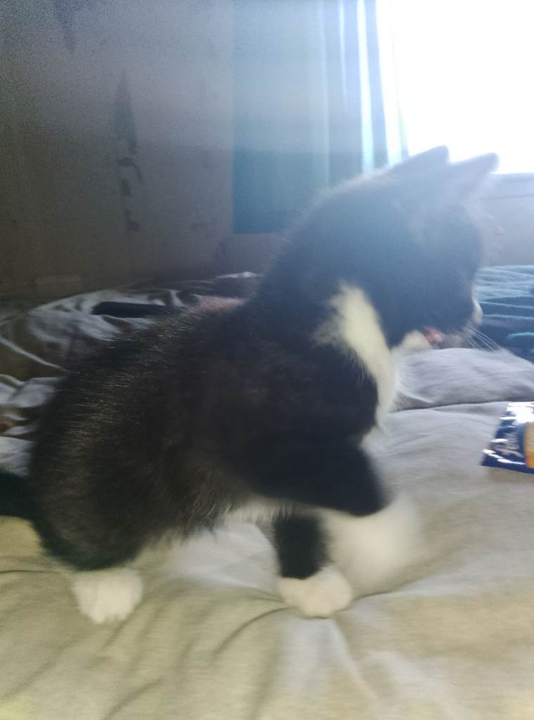 3 kittens 1 male 2 female 2 short haired and 1 long haired the two short haired are black and white an the long-haired is all black but has small white part on her chest