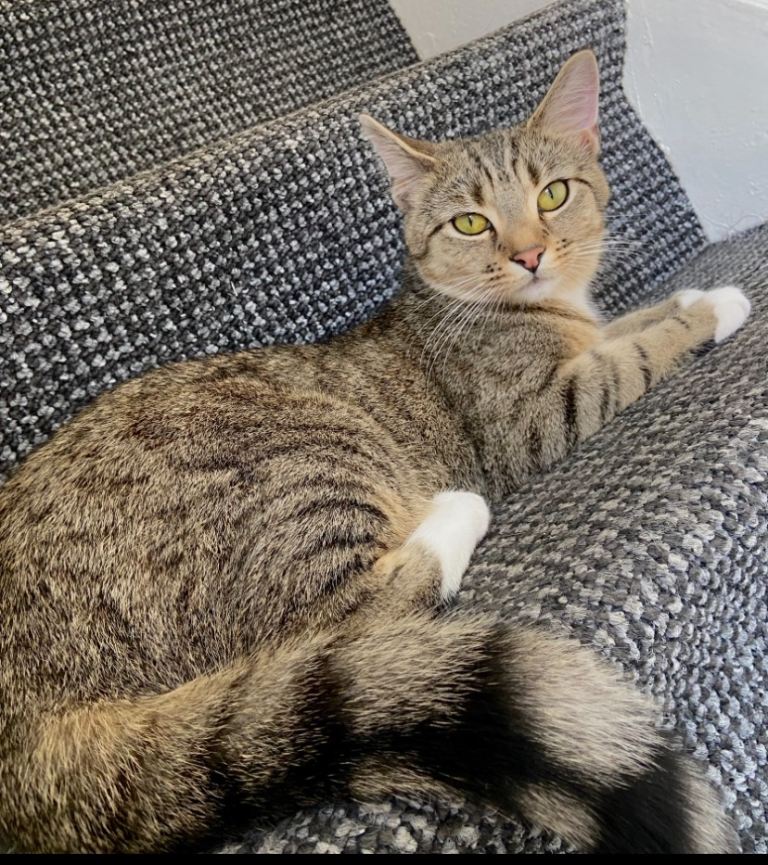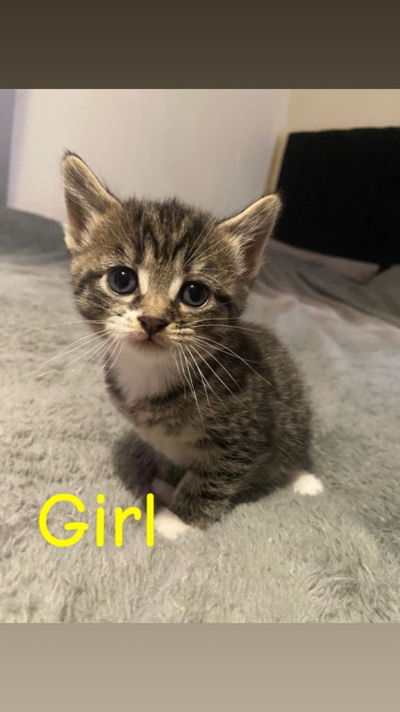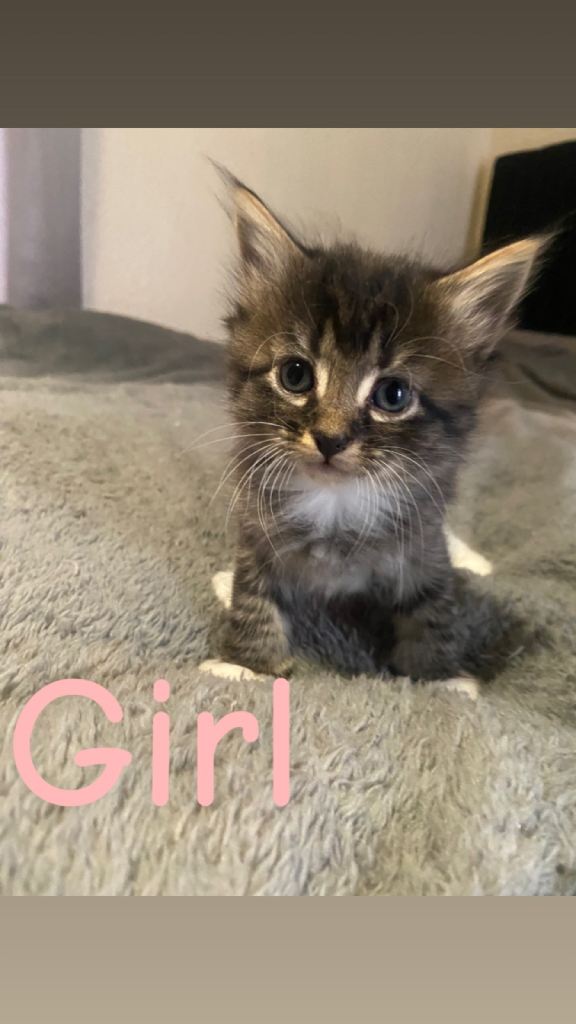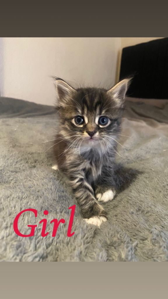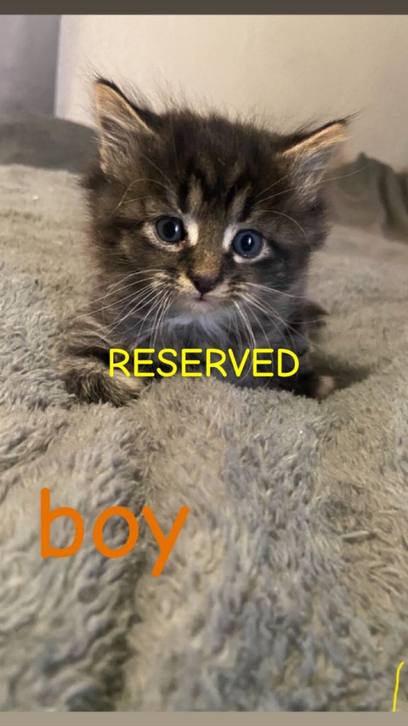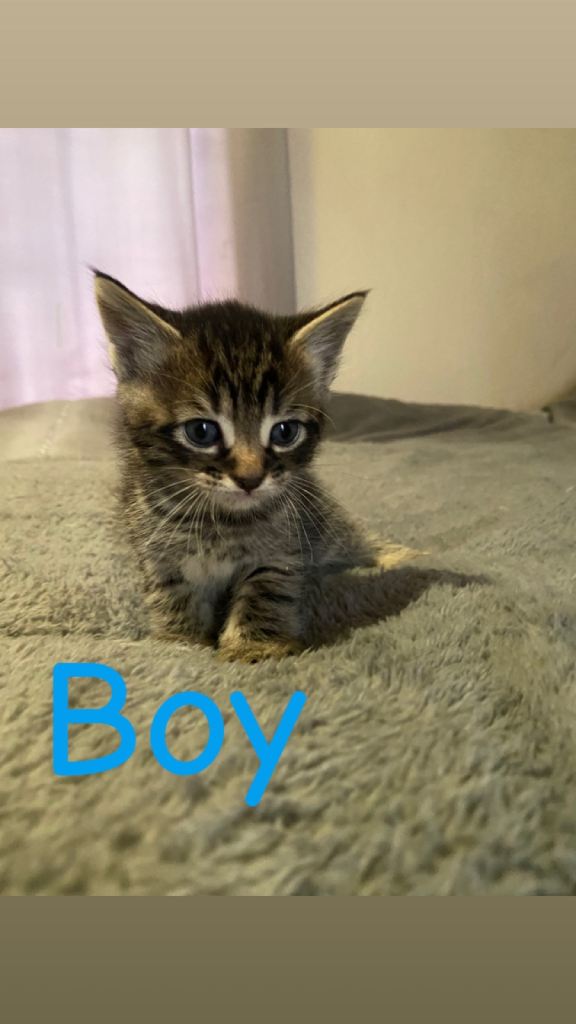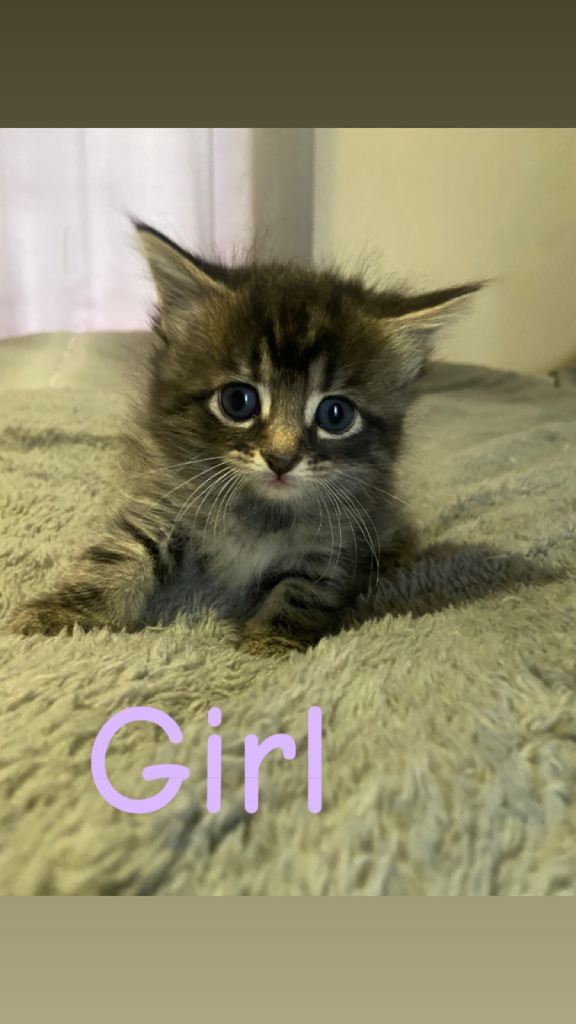 Purple girl - full fluffy tabby/grey female, purple girl does not have a tail. No deformity, unfortunate accident during birth where her mum had mistaken her tail for the cord as she was her first born. Fully checked over by vet. Causes kitten no issues, jumping, climbing and running as normal.