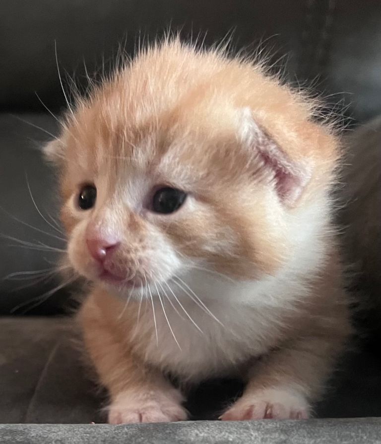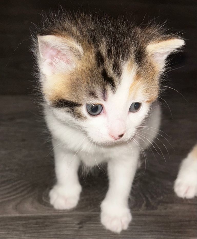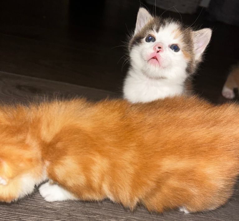 Each kitten has unique markings, a mix of ginger, white, and calico.
