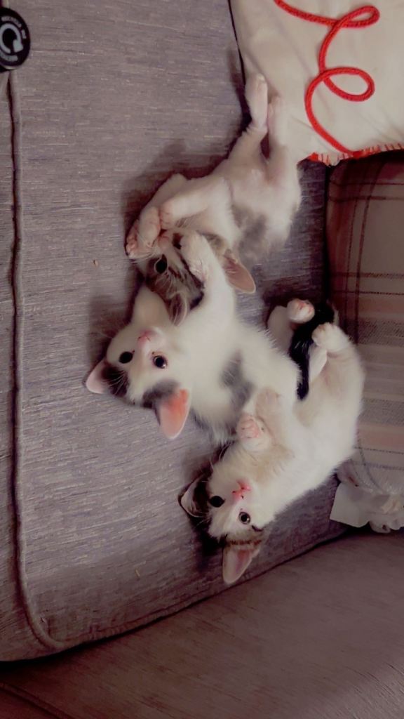 3 little kittens ready to go to the new locking home . 2 white kittens and one grey . Very playful and lovely . Sibirian with Persian