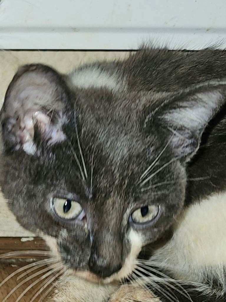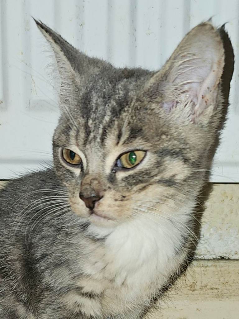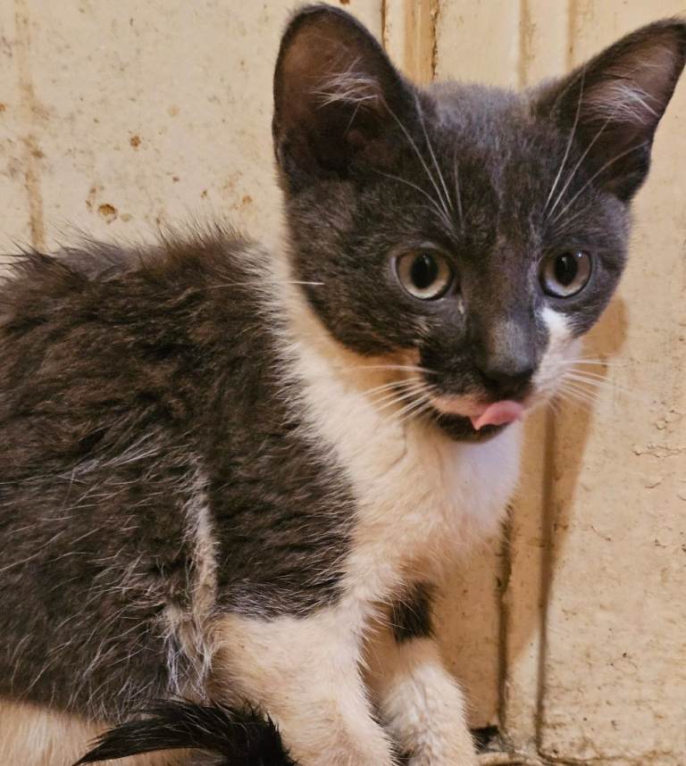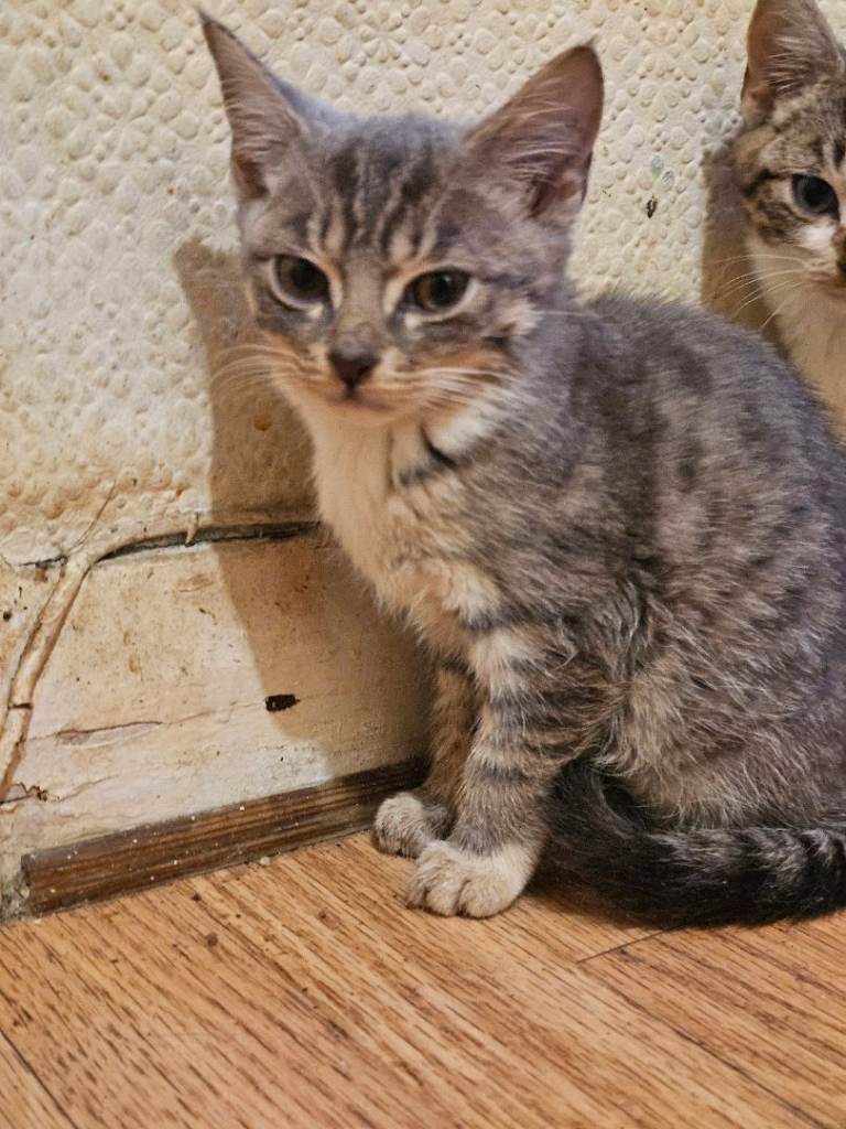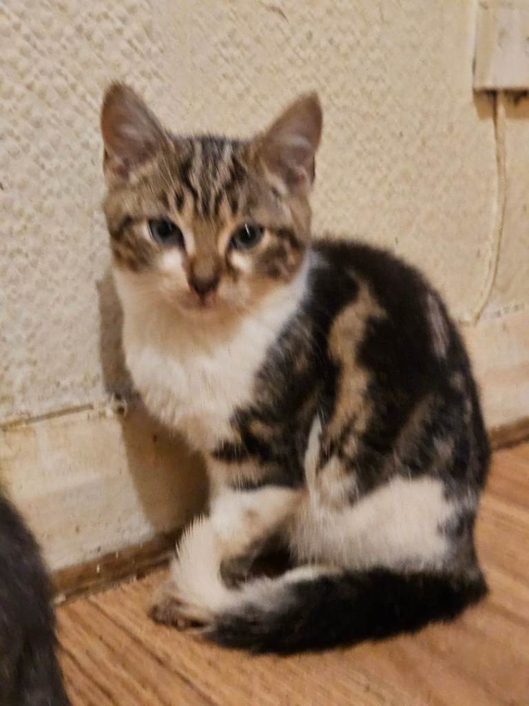 Mixed litter black and white kitten looks almost silver tabby is very very lightly coloured pics do no favours