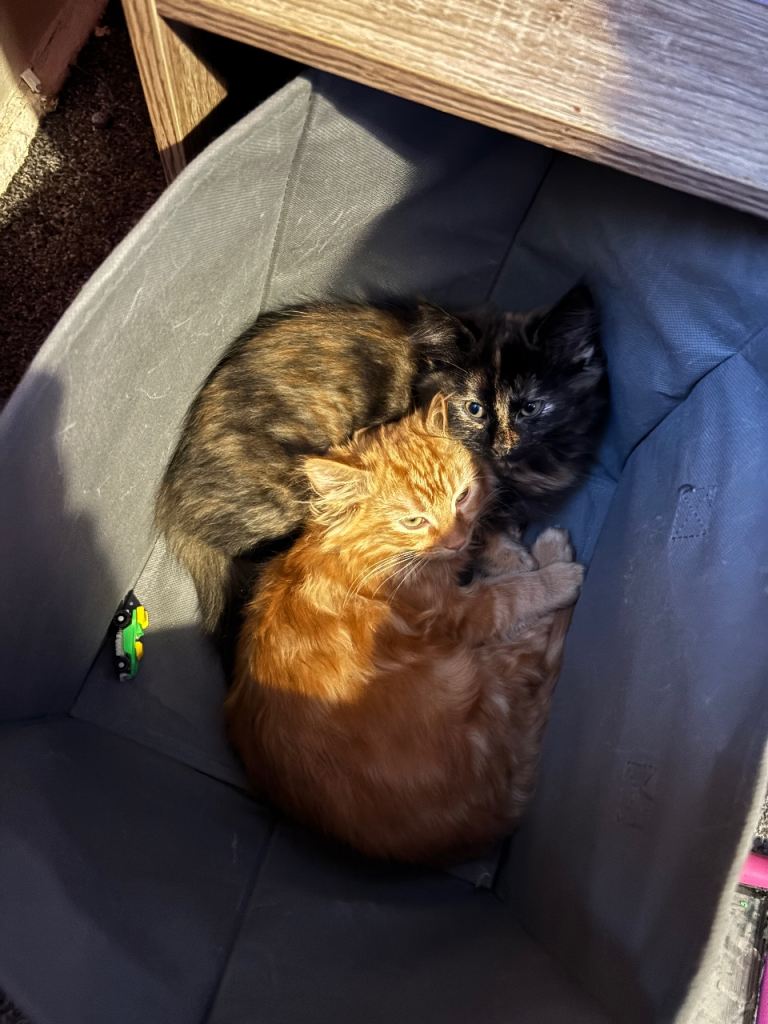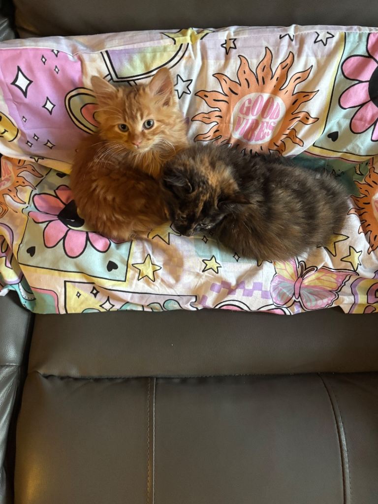25 weeks old kittens for sale the wee ginger one is a wee boy called messie and the other one is called Rosie both brilliant with kids and dogs we are having to rehome due to having to go into homeless and not being able to take them with us. They are fully litter trained had all there jags and been microchipped in perfect health we are gutted to have to rehome them :( looking to find the right person for them as they are great kittens. Have a brilliant nature