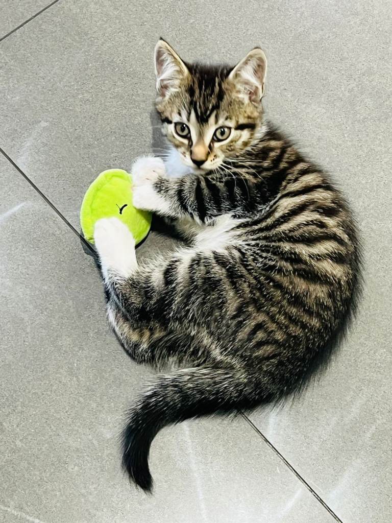Kitten 2 female grey stripped looks a bit bengal like very outgoing again super friendly and the most confident of the litter first to try everything.
