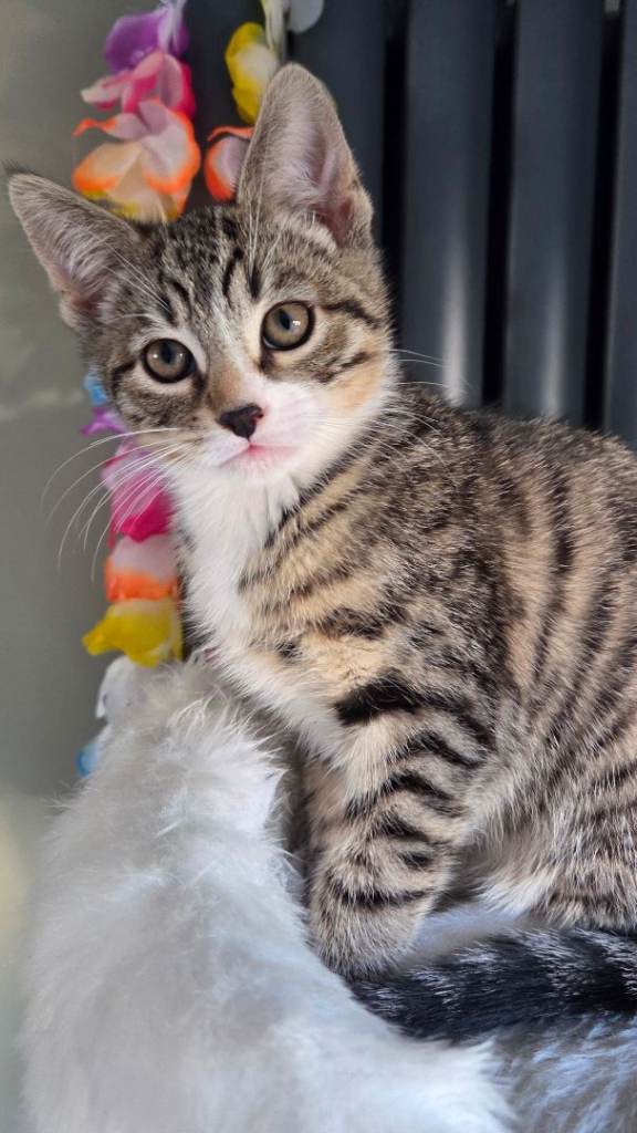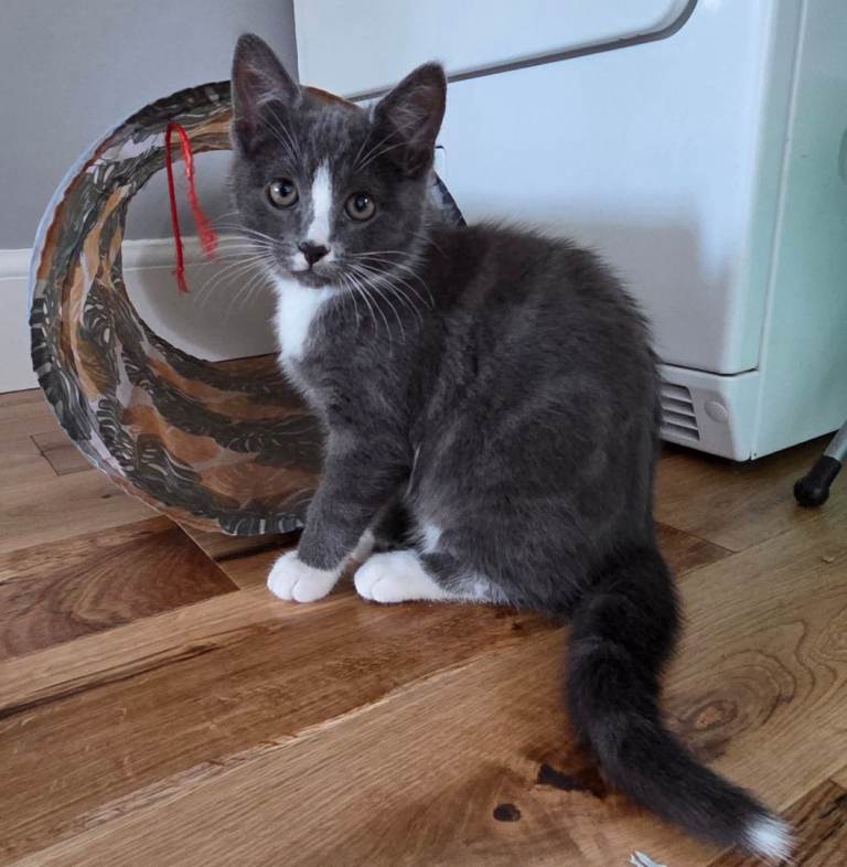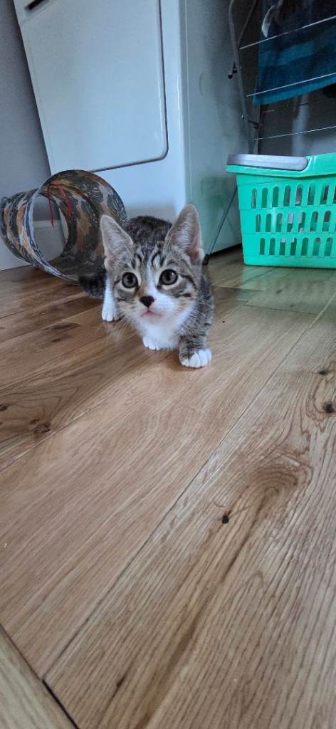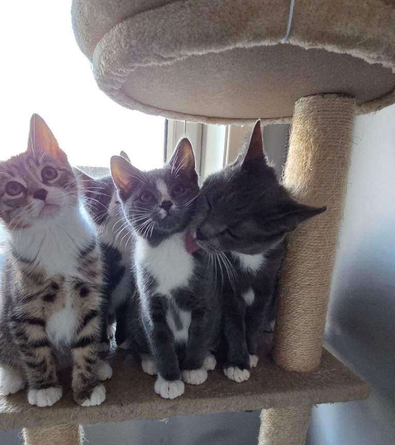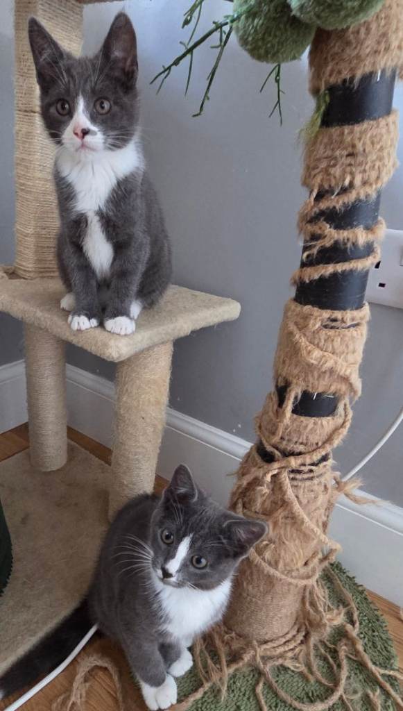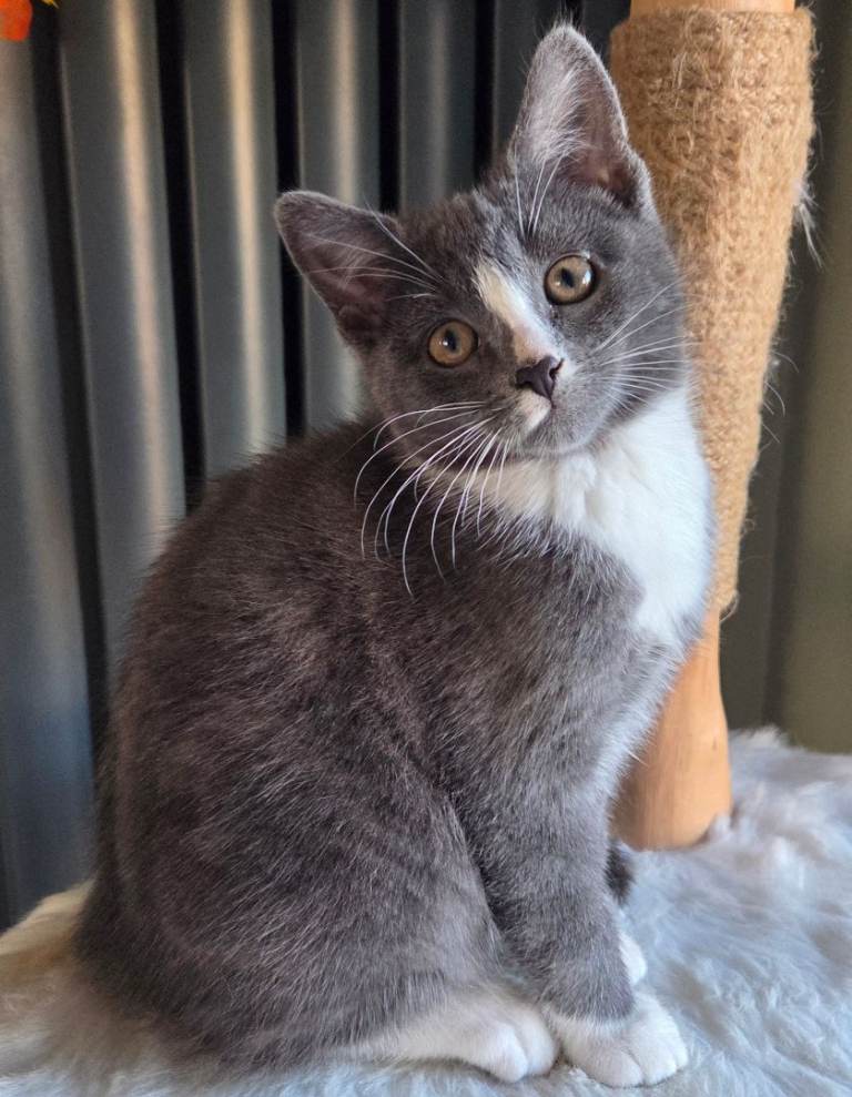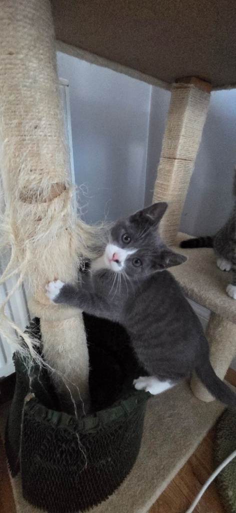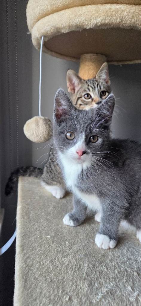 I have 3 adorable kittens 1 girl(grey and white with little black spot close her nose)and 2 boys looking for new homes. They're playful, enjoy being around people, have been treated for worms and fleas, and are toilet trained. They're eating dry and vet food, plus snacks, and drinking water. The mother is a Korat mix and the father is a Bengal. They are used to being around children and other cats. If you need more details, feel free to reach out. Thank you.