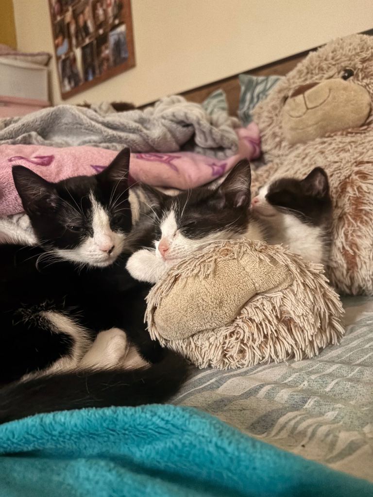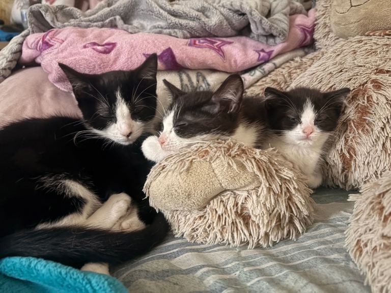3 black and white kittens. Lovable, playful and litter trained. 2 girls, 1 boy.
