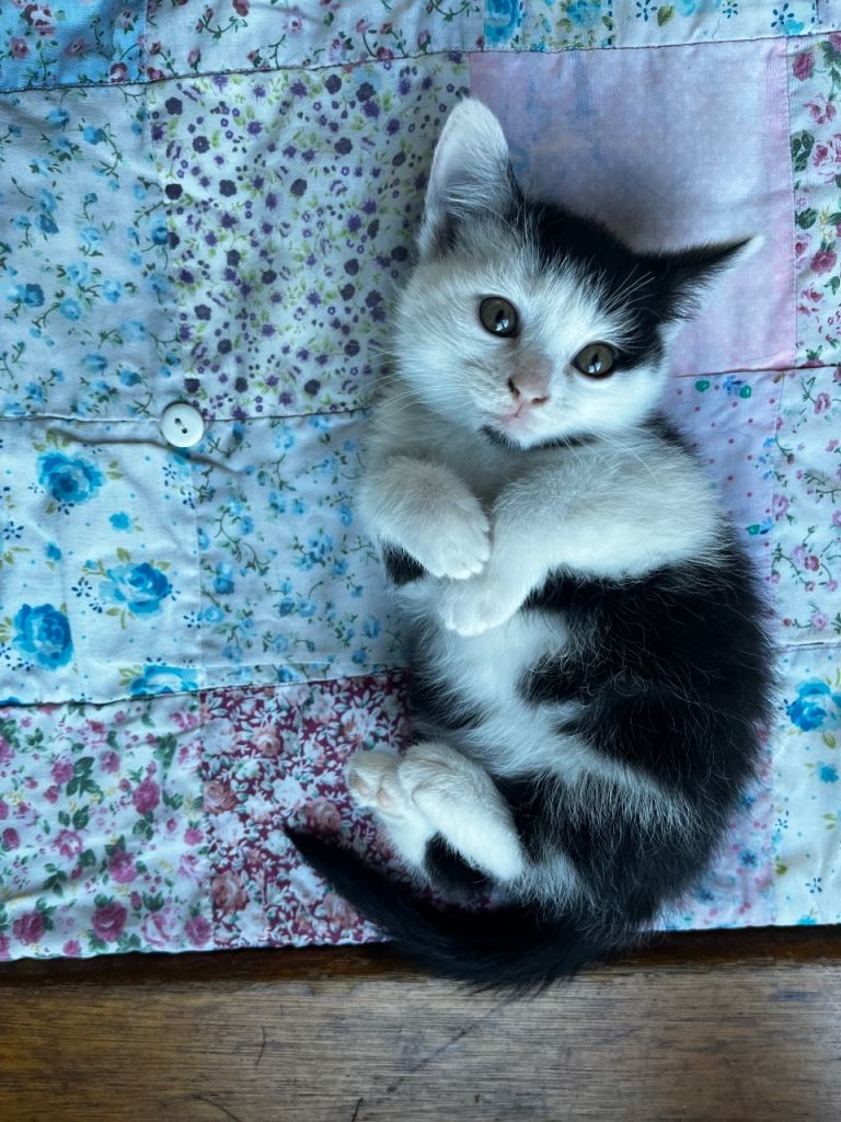 One, black and white girl kitten.