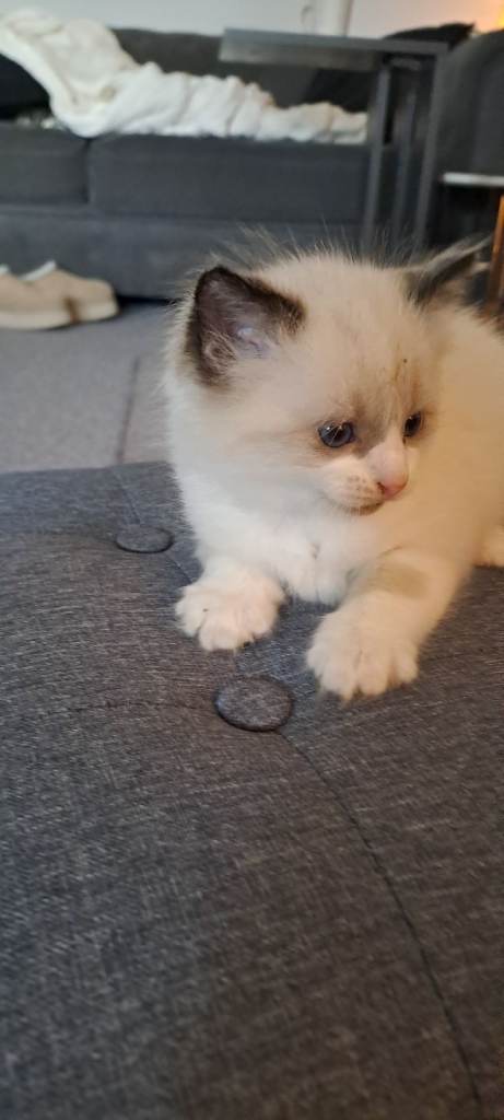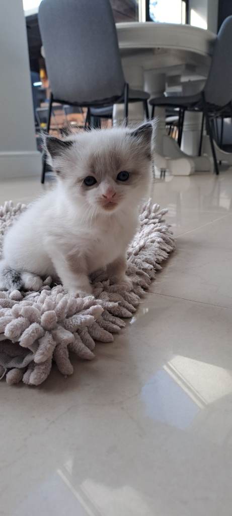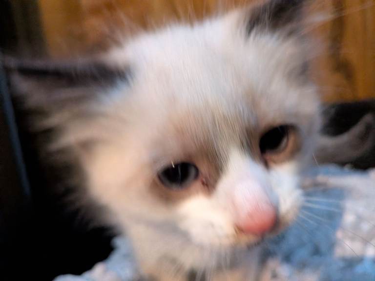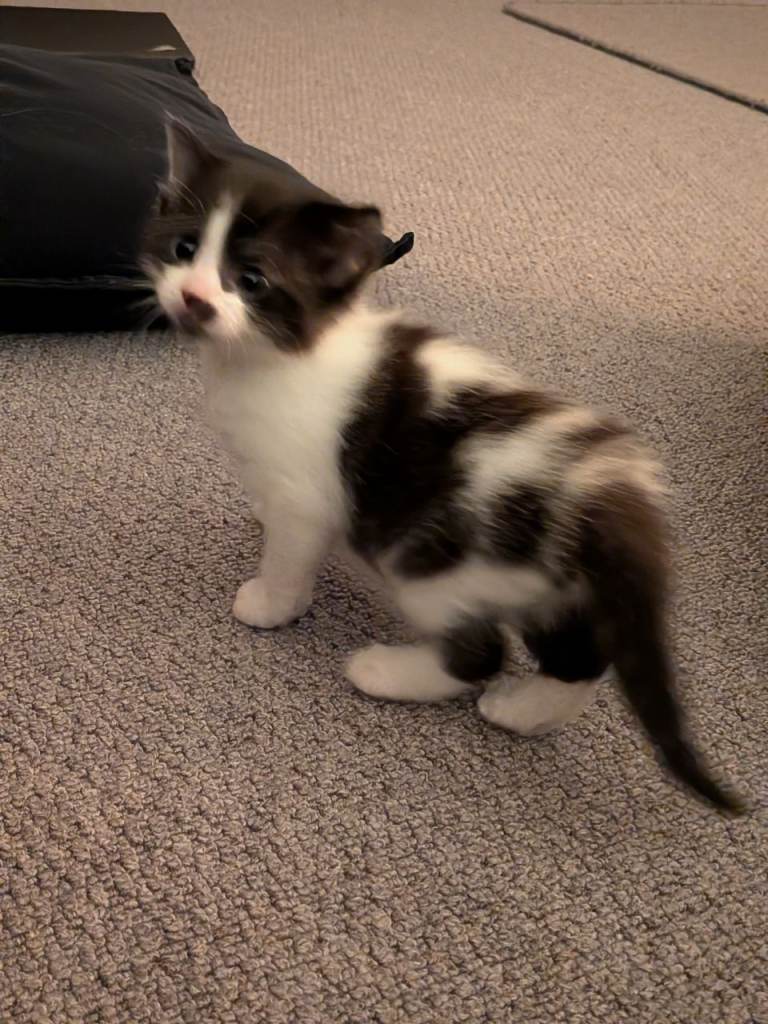 Ragdoll-type mix often grows up very affectionate and calm, and the black-and-white ones are typically confident, playful, and people-oriented.