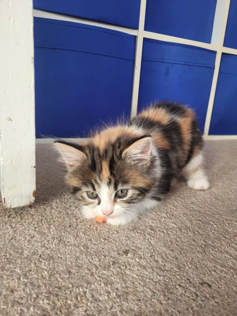 They're eating Scrumbles kitten biscuit and whiskers kitten jelly pouches. Using Amazon clumping corn litter. Both really healthy and chunky. Darker one is slightly bigger. They get along well and sleep huddled up so could go together. I can provide pictures of mum and dad if needed. Dad is an orange tabby colour and mum is a black and white tuxedo with a medium to long coat. Both can be seen at my house.