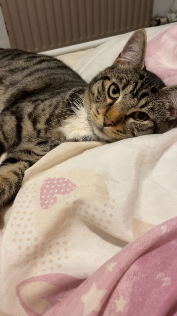 He is a 9 month old male. He’s affectionate and has a lovely personality, but he is quite vocal and would suit a home where someone understands cats well and is comfortable with this.