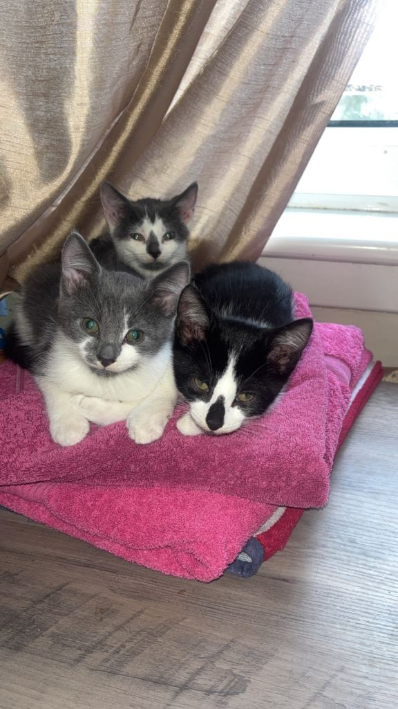 One black and white tuxedo stunning male and 2 grey and white stunning cats one male one female all litter trained and eating solid food As above they are amazing loved kittens ask me more if you are genuinely interested