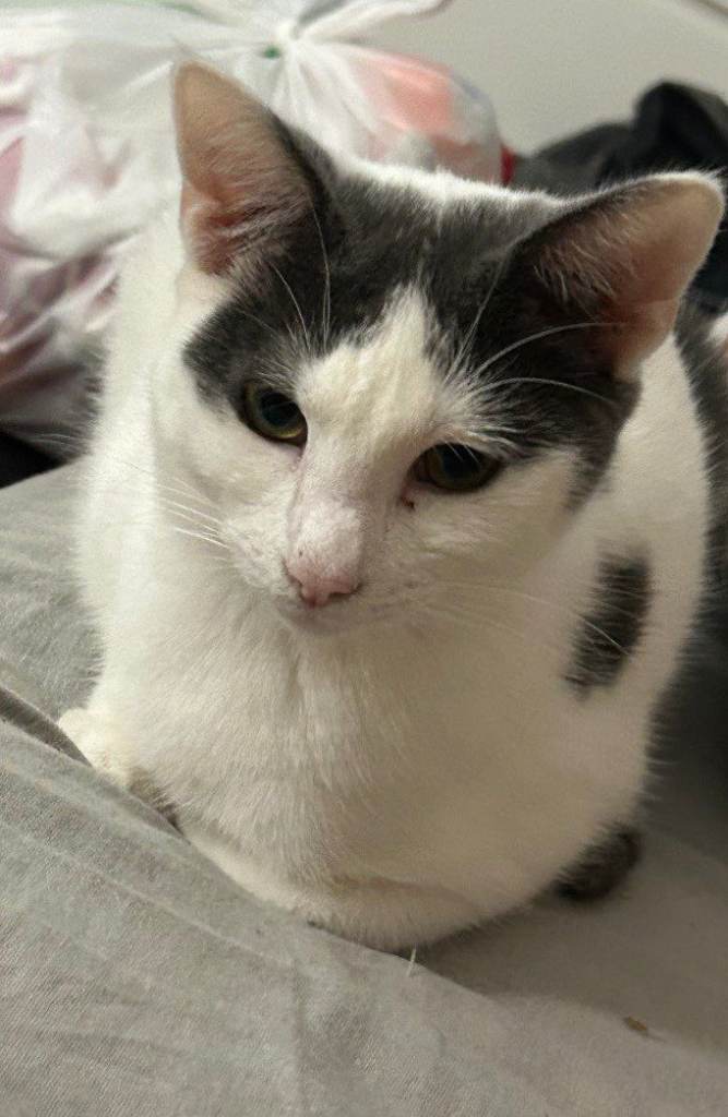 Odin is white & grey and a big sook loves strokes and is neutered he is 1 year old and microchipped