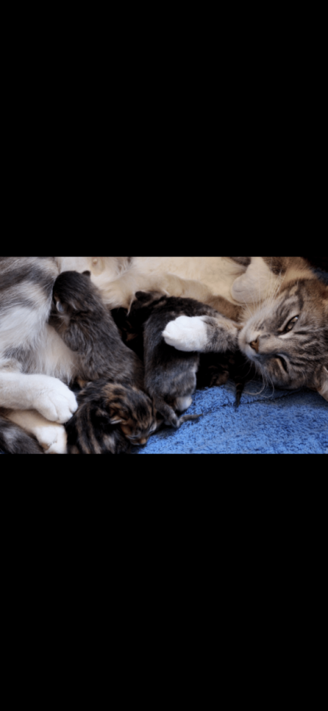 Mum is a British Shorthair mix, calm and affectionate, and can be seen with the kittens.