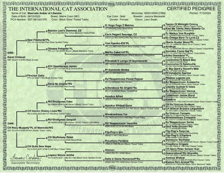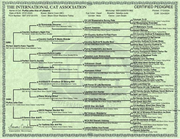 Both parents are registered as SBT under TICA. Both 5 generation pedigree and DNA tested through MYCATDNA. A printout of the DNA & Pedigrees will be given to keep for your own records.