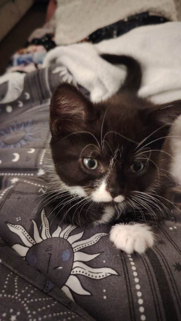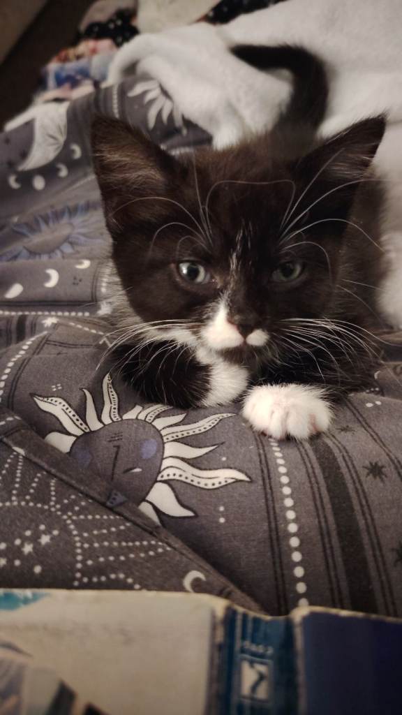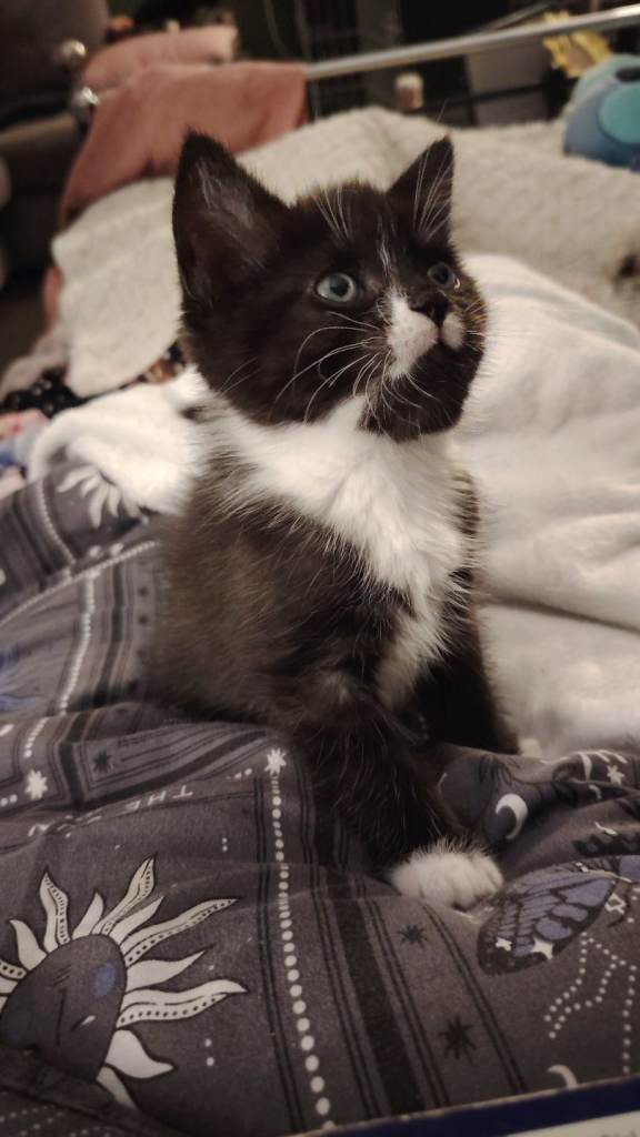 One male kitten available due to being let down. 8 weeks old, black with little white markings