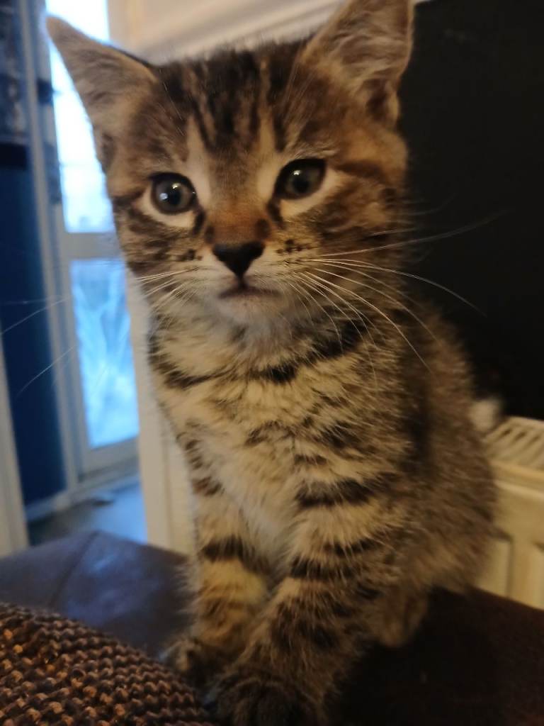 2nd kitten is a tobby kitten she is gorgeous little character but very shy she needs time to come around she is not keen to be around kids so best would be someone without kids .