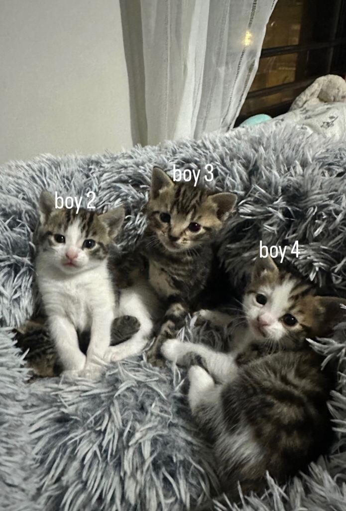 These 4 lovely boys all need responsible and caring forever homes. They’re all wormed and litter trained, any further details needed? Feel free to get in contact with me and let me know if you’re interested!
