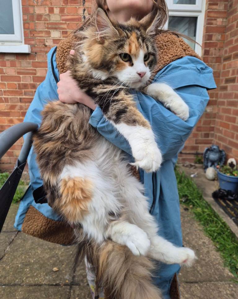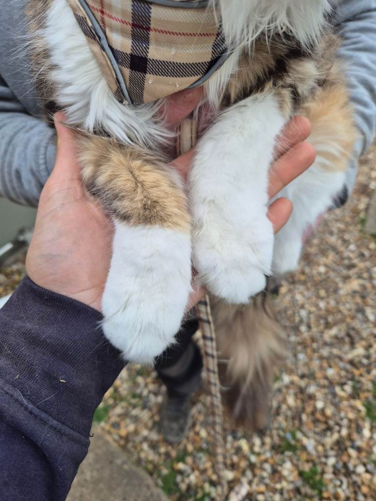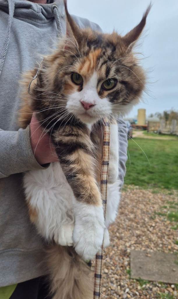 Bella is a 1 year old full MC. Both her parents are registered at TICA. She was born with wonky legs, but it does not affect her in any way. She is running and jumping around, playing with everybody. She will follow you like a shadow, and sleep in your bed if you let her. She has got the sweetest nature, good with other cats and have met dogs before. I finished breeding a while ago due to my health issues getting worse, I can't keep pets anymore.
