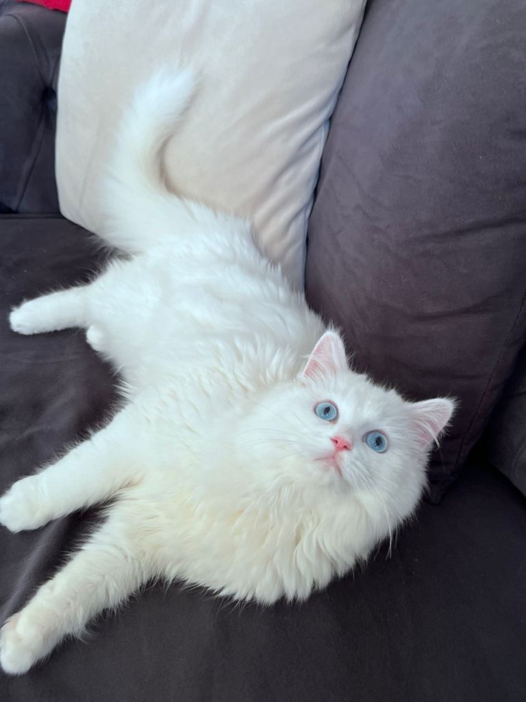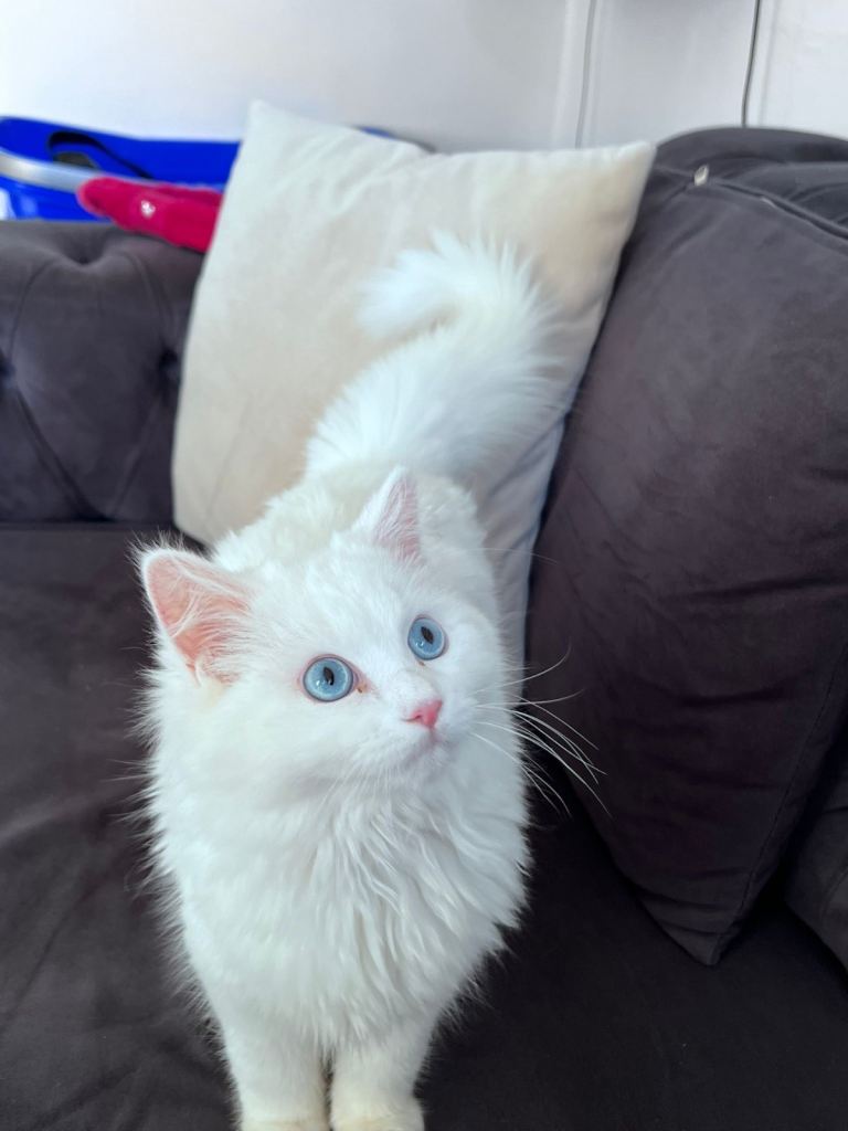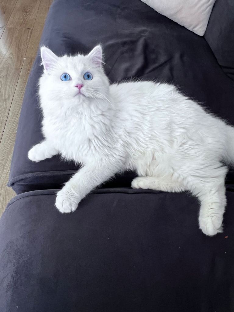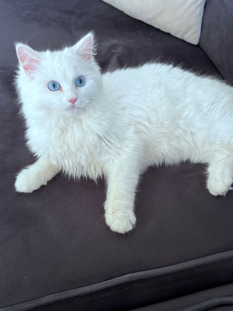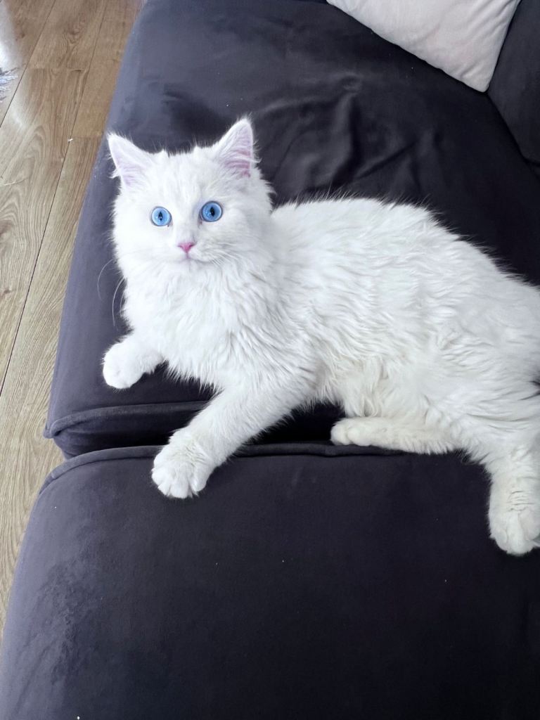 I am looking for a loving home for my gorgeous 7.5-month-old male Persian kitten. He has stunning bright blue eyes and a very soft, fluffy coat.