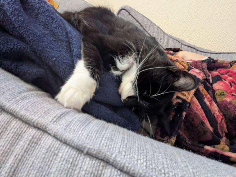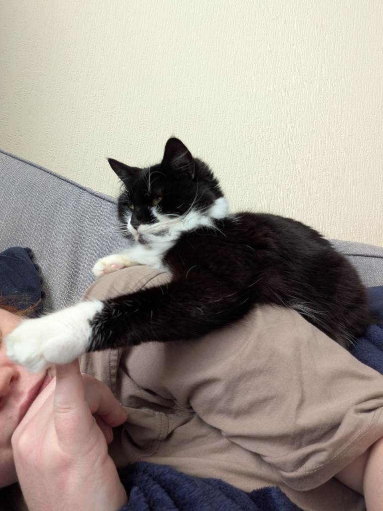 Lay on the sofa with a blanket and she'll come snuggle up on your lap all night!