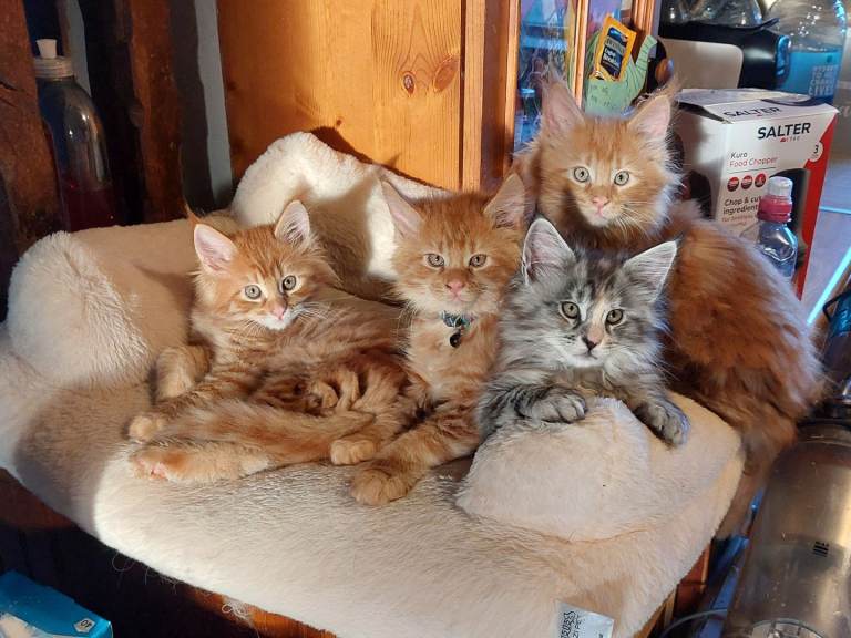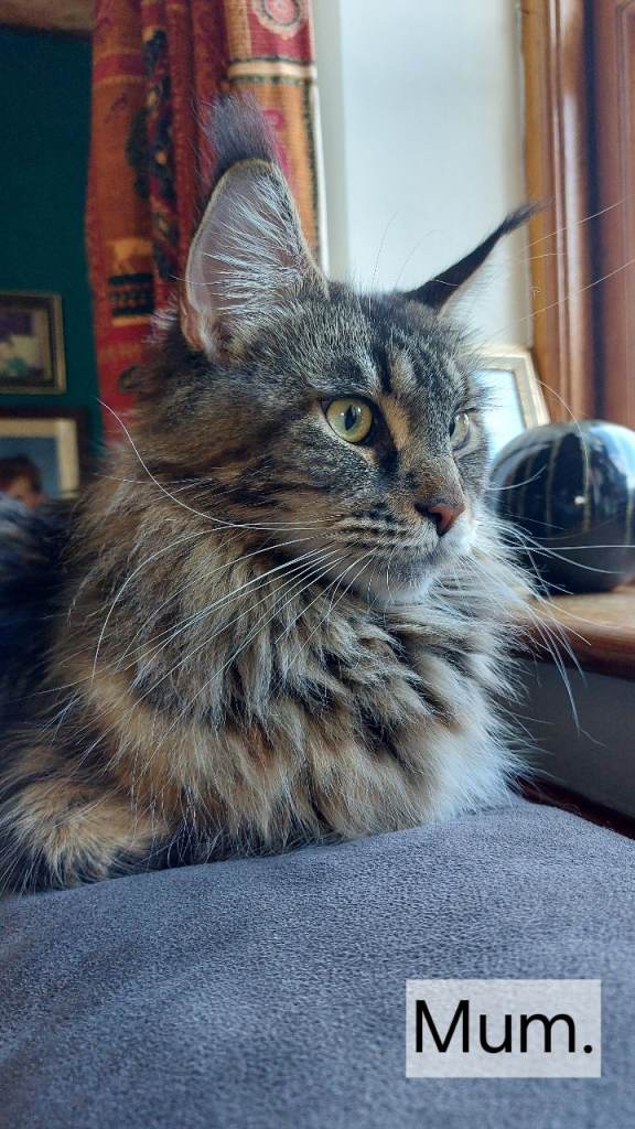 Mum is my own home bred Maine Coon. Her mum & dad are also our pets, so you can meet the family! They are not registered.