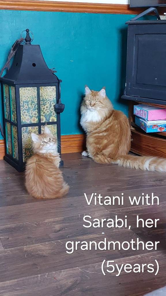 Beautiful, rare ginger female! Pictured with her grandmother who has grown into a mighty Maine Coon!