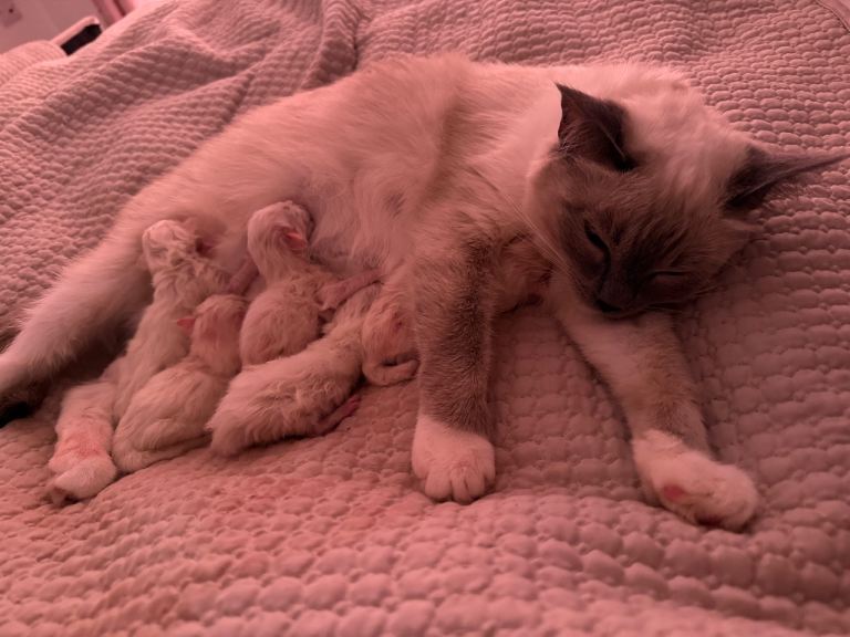My beautiful ragdoll and Siamese female just gave birth to 5 healthy beautiful kittens today, the dad is a pure ragdoll. Both parents have vibrant blue eyes, pink paw pads and white feet and paws.