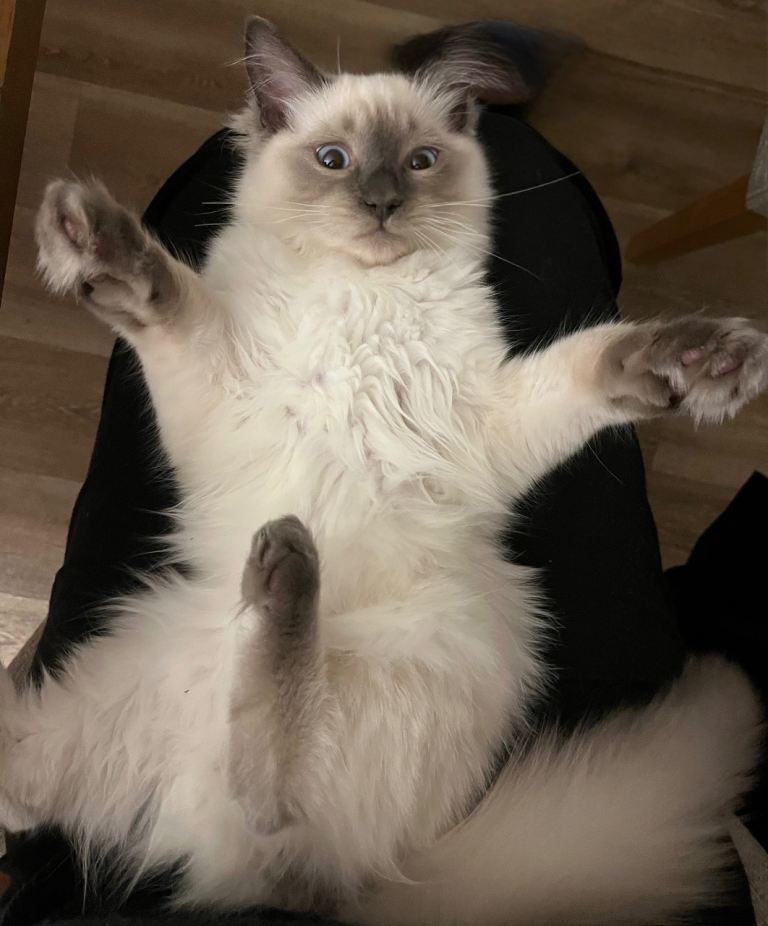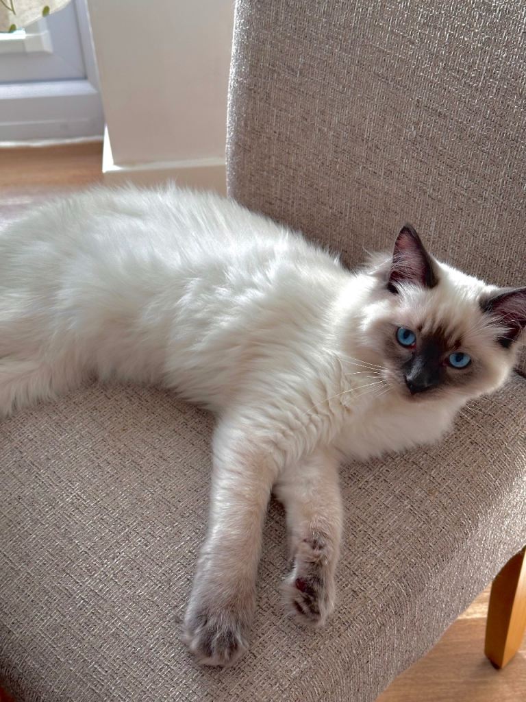 It breaks my heart to rehome him, but sadly he just isn’t getting along with my older female cat despite every effort. Because of this, he would be best suited to a home with no other pets, or possibly with another young male kitten of a similar age and temperament.