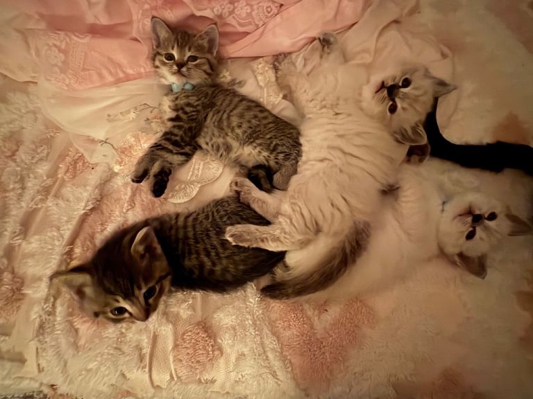 The kittens are thriving, currently on a diet of wet and dry Royal Canine. Fully litter trained - no accidents to date ☺️