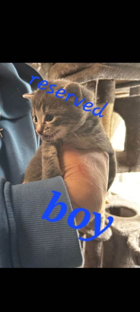 This is a lovely mixed litter. All white kittens have striking blue eyes. One white and black, grey and unique tabby girl.