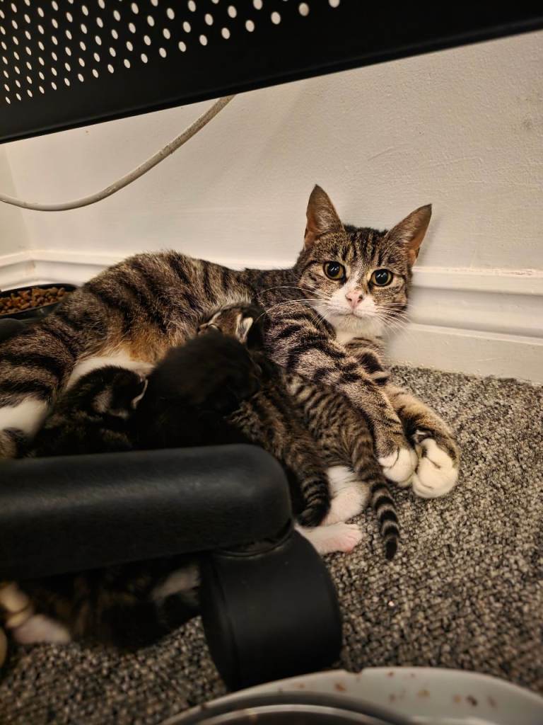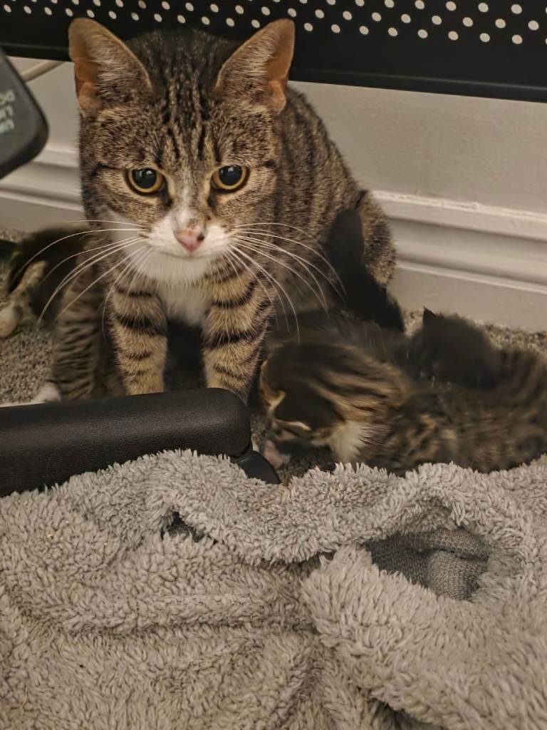 We currently have four kittens available for adoption in April, in addition to their mother, who will be available once she has been spayed and all kittens have been placed in permanent homes.