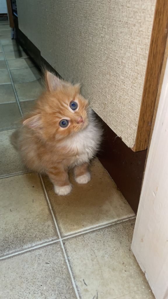 Playful and friendly ginger kitty trained to eat and drink by herself. Think its a female. Mixed breed long hair.