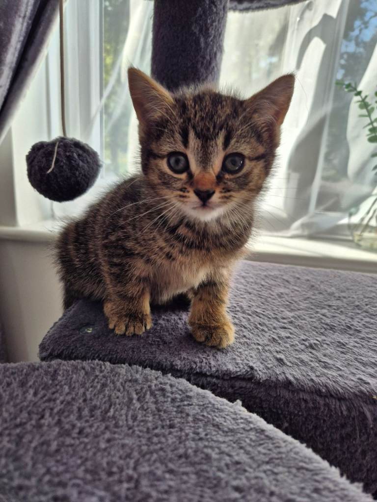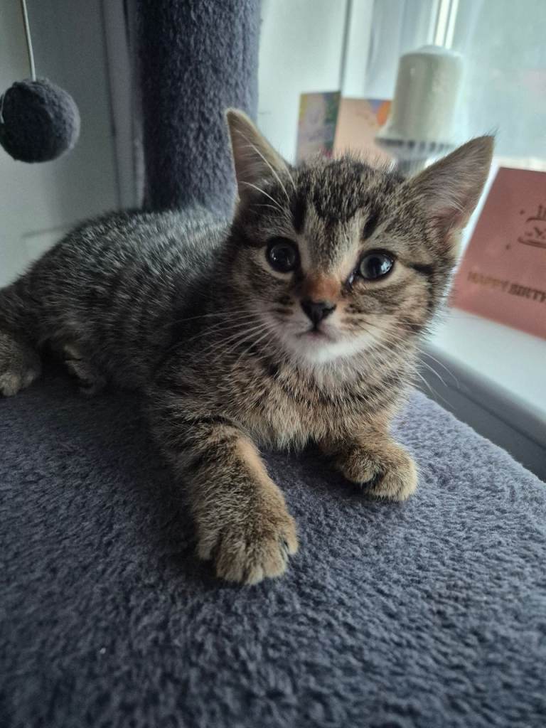 Lovely female tabby kitten ready to go to her loving forever home on the 14th april. She is the last kitten left of a litter of 4.
