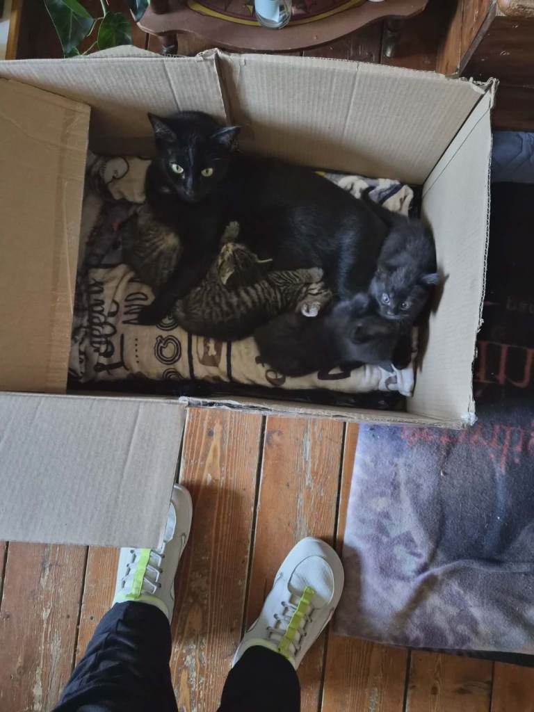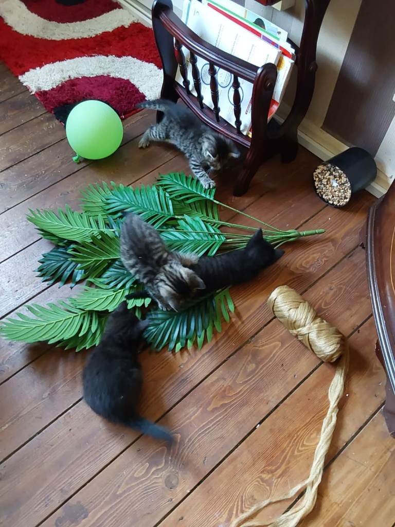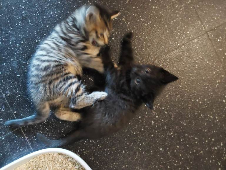They are 7 weeks old, but they eat wet and dry food. They drink water already. They use cat litter tray, as well.