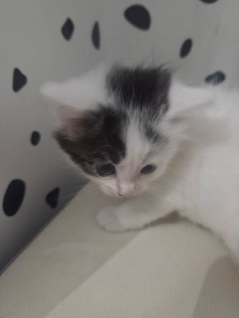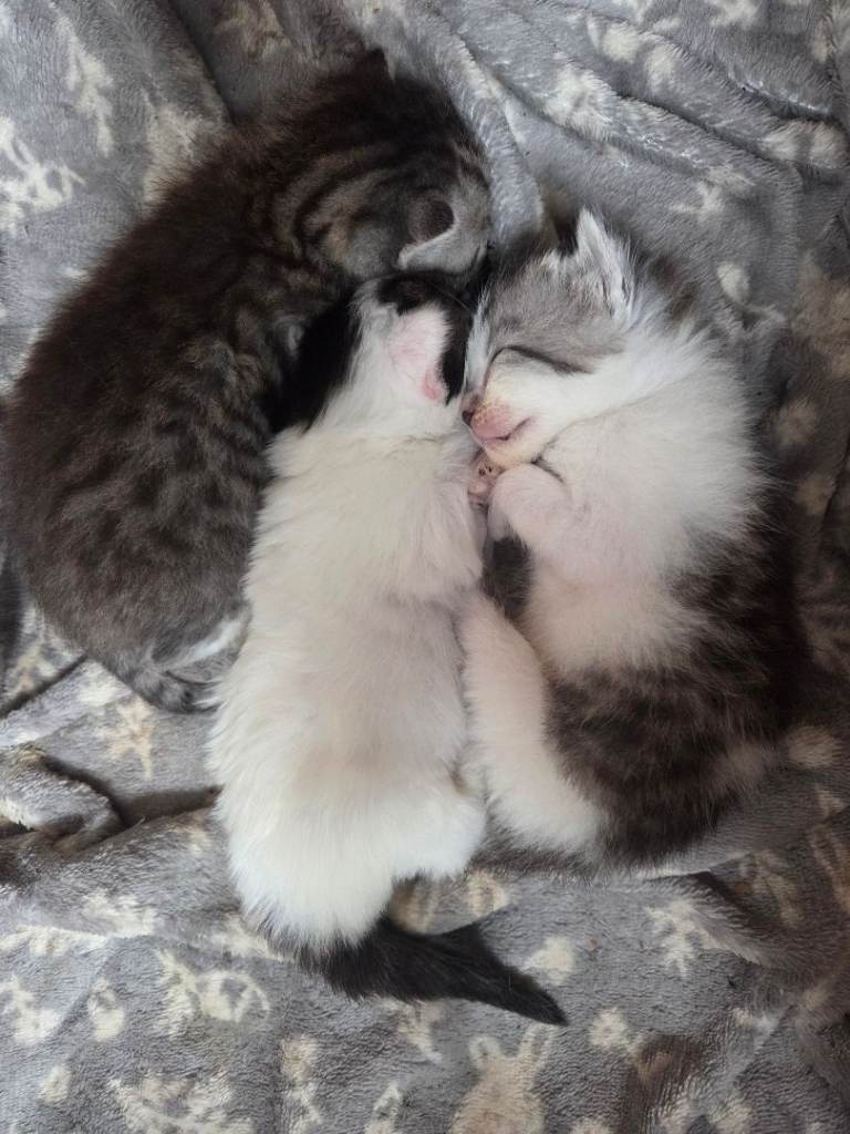 3 little boys, a grey tabby, grey and white tabby and a white with little tabby head splodges and black body splodges!