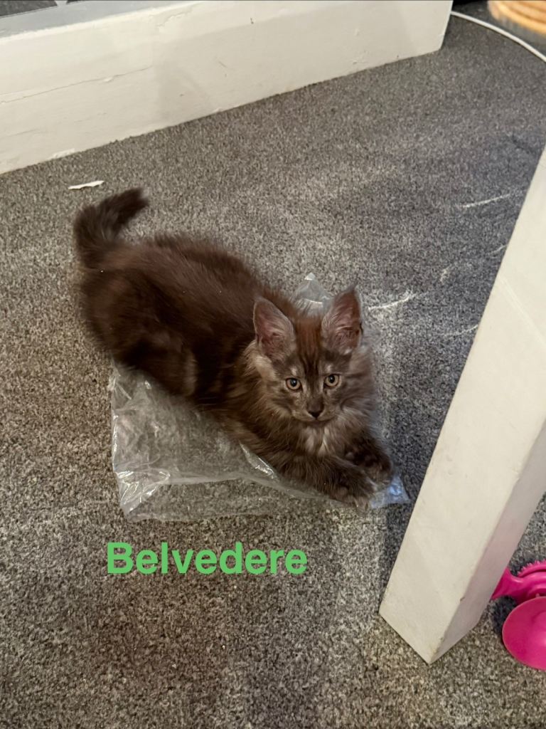 😸- Belvedere (Grey Boy): Playful with striped tail, loves chasing his white-tipped brother.