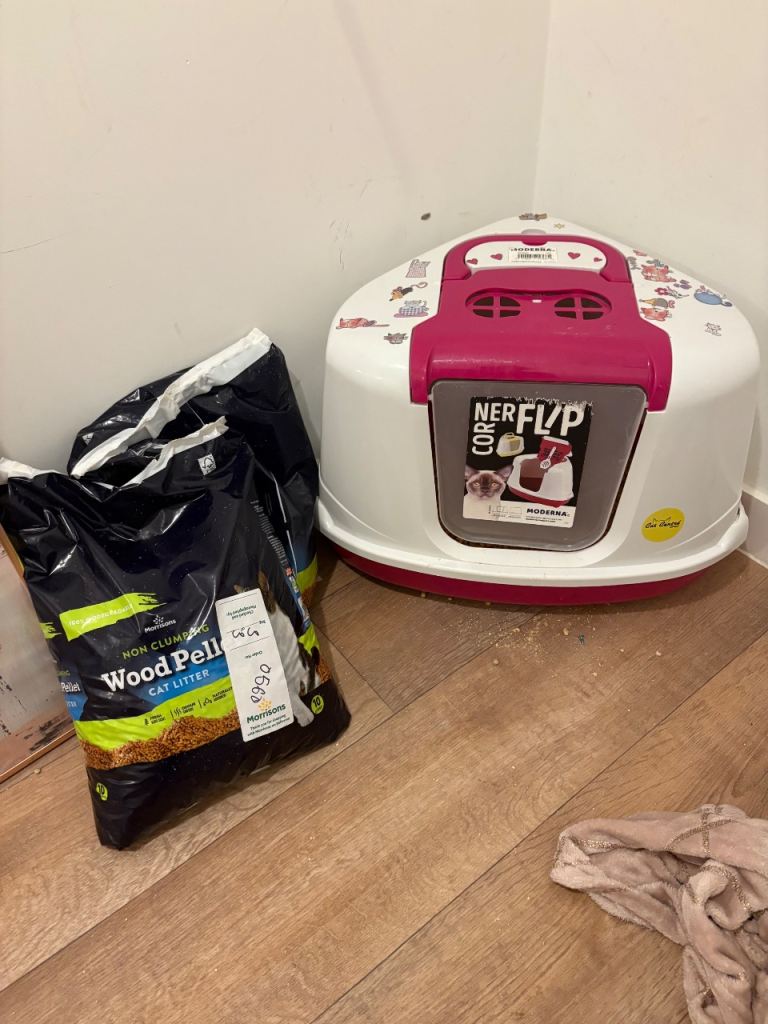 Large cat tree / automatic water dispenser / pet kit feeding bowls/ corner litter box /remaining 2 bags cat litter and a few of her little toys / Cat carrier