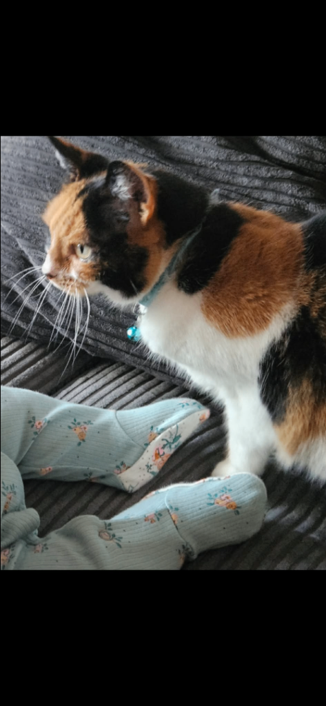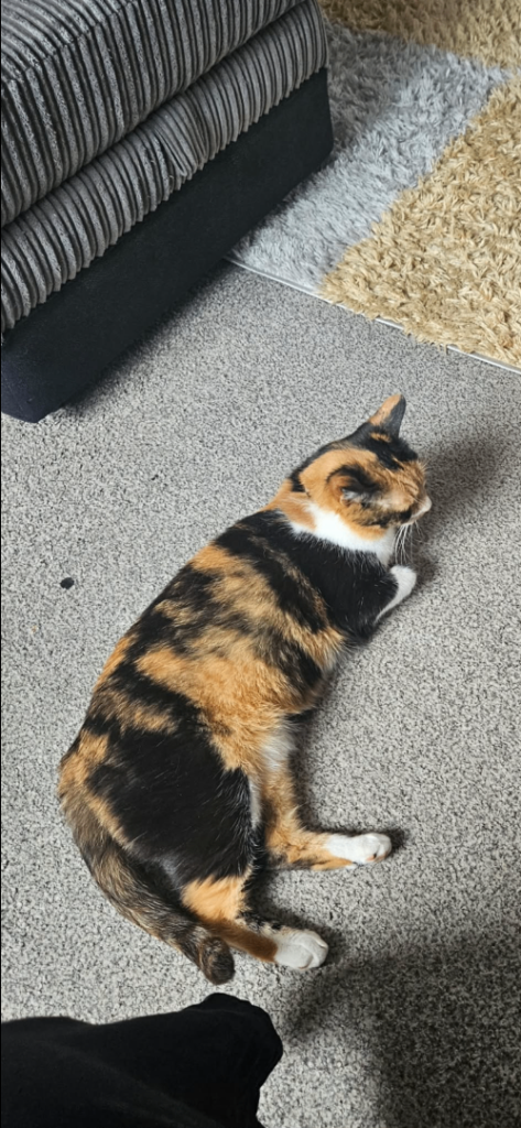 She’s a 6 year old tortoiseshell female cat that has been spayed and needs rehoming as doesn’t get on well with the family dog. She doesn’t like other animals so preferably no other animals in the house. She’s a loving cat that likes being in your company but not a lap cat.