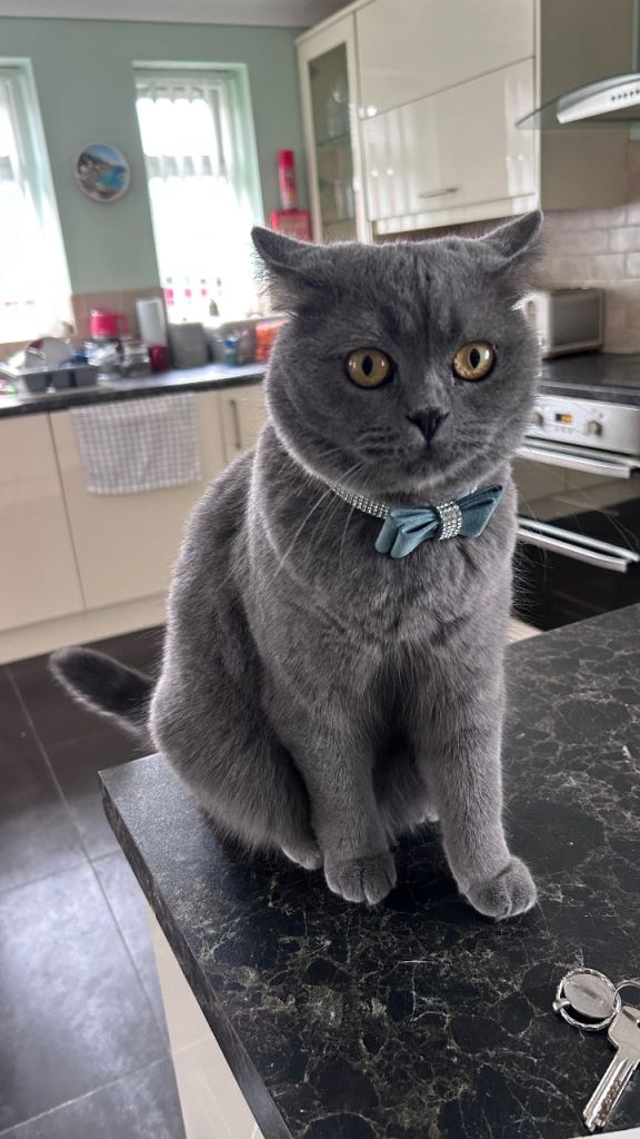 Male is called blu he is a big handsom boy he is long haired grey boy he can be shy at start but he comes out his shell he is very friendly and loves his cuddles