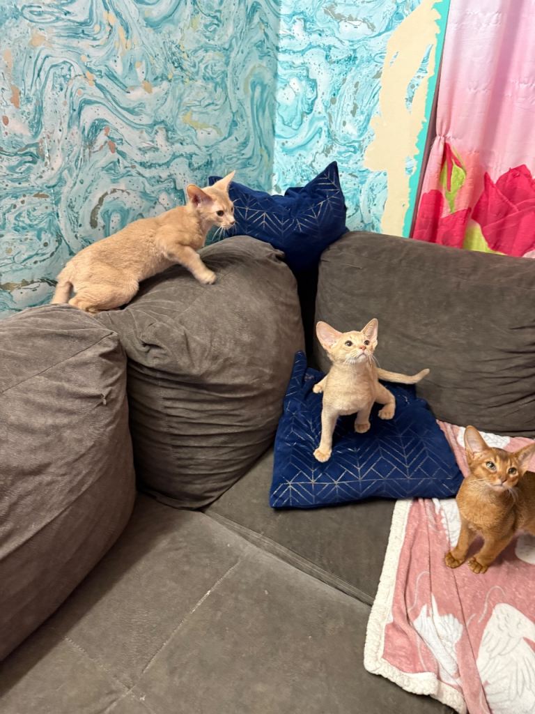 Abyssinian kittens, born on October 3rd, 2025. They are active, playful, and already looking for loving forever homes.