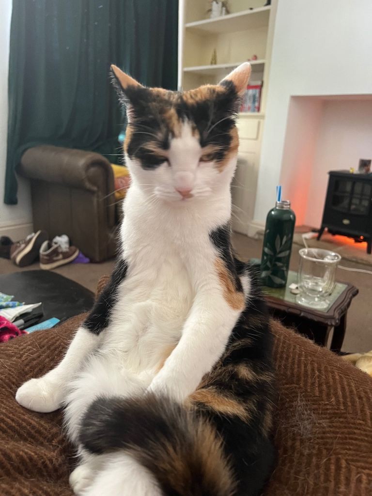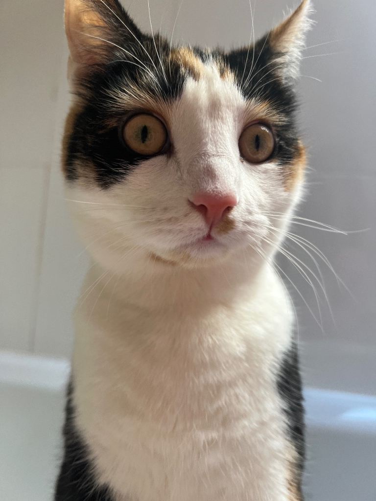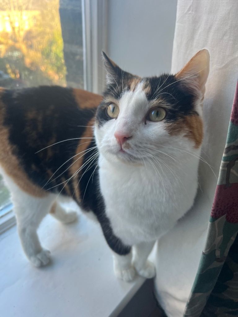 3 year old female calico with gorgeous affectionate temperament needs new pet free home due to struggles with other current cats. Great with children