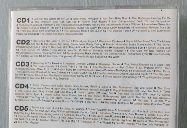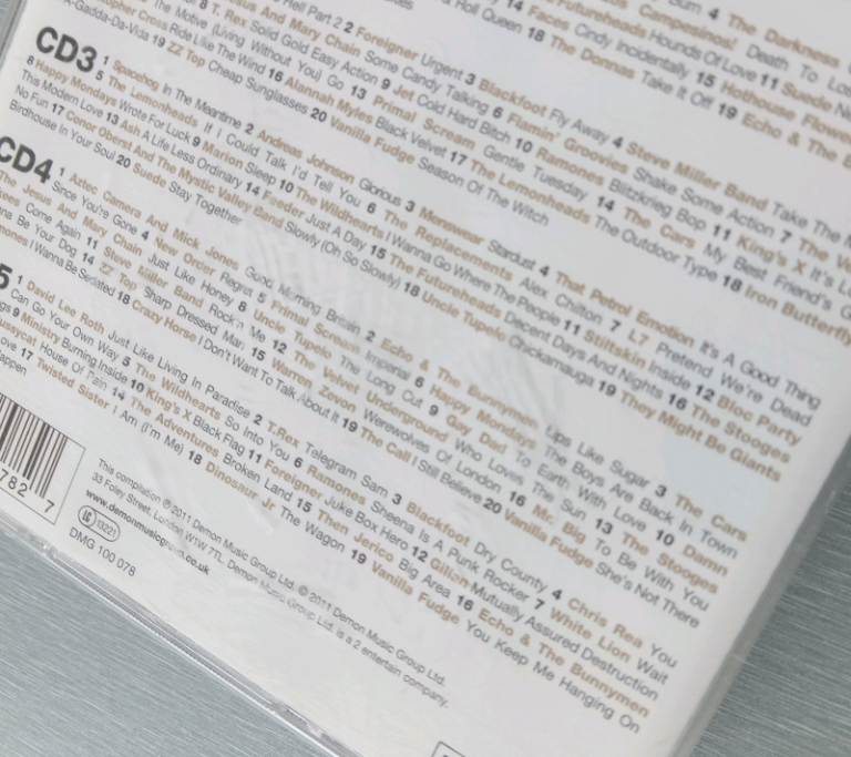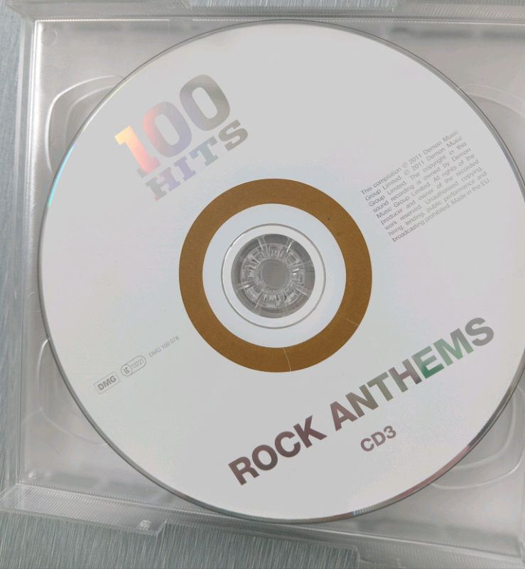 5 Discs of Classic Rock Anthems from artists of the 60's to the 90's. Groups include Suede, Primal Scream, Foreigner, Ramones and others. The set was released in 2011 by Demon Music Group. See photos for details. I last played this all the way through over a few weeks during August & September 2023. Disc 1 skips at the very end of track 20. Every other track plays fine all the way through. Some good songs and music. The inlay is good and the plastic case is good and working including the rings that hold the discs in. The outside of the case has handling wear and tear the back being worse than the front (see last photo). Reason for selling is that I am downsizing my CD collection. Postable at £3.50 with Royal Mail. I will combine with other items I am selling.