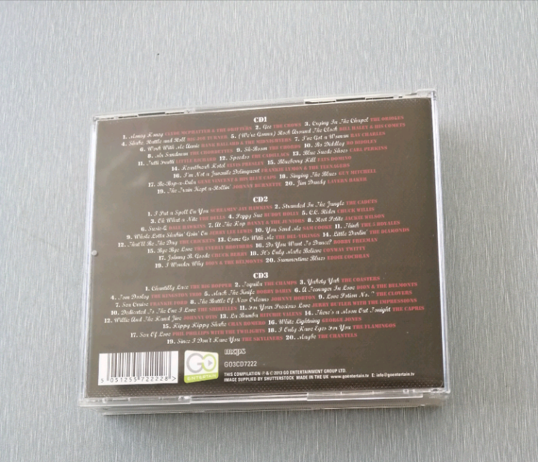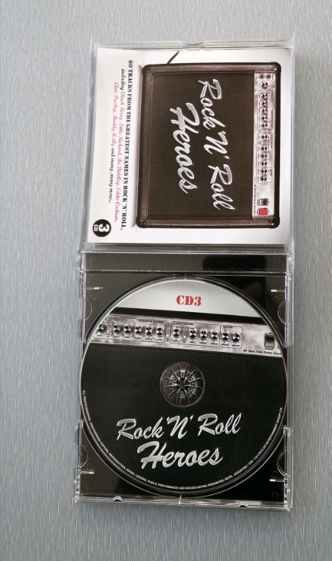 This is a 3 disc cd compilation titled "Rock 'n' Roll Heroes". It has a total of 60 tracks (20 per disc) of rock and roll music from the 50's and 60's eras. Artists include: Chuck Berry, Little Richard, Elvis Presley, Buddy Holly, Jerry Lee Lewis and others. Songs include: Crying in the Chapel, Shake Rattle and Roll, Heartbreak Hotel, Summertime Blues, Chantilly Lace and more. I can provide more photos of song and artist details etc. It was released in 2013 by Ho Entertainment Group Ltd which was around the time I bought it. I played it through once then. It has a good selection of songs and artists of the period. I have since played it over the last 2 weeks of June 2024 to makes sure it still plays ok. The general condition is very good and it plays as it should. The plastic case and inlay is also very good. I am selling because I am downsizing my life's cd collection. It can be posted, it can be collected or I can meet within a reasonable distance. I have other items for sale including other cd's and I would be happy to combine and do a deal.
