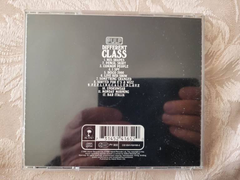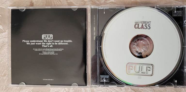 The Pulp "Different Class" CD is a 12-track album released in 1996 under the Record Label Island / Universal. Hailing from the United Kingdom, the band's Britpop style is on full display with hits like 'Common People' and 'Disco 2000'. The CD comes in a standard jewel case, showcasing the British rock genre in the 1990s era. With a run time of 3123 seconds, this album is a must-have for fans of Pulp and Britpop music. The disc is completely fine but the plastic center CD retaining clips have broke off.
